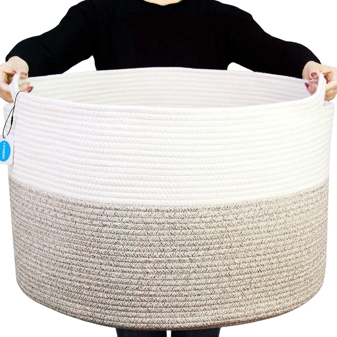 XXXLarge Katoenen Touwmand voor Woonkamer - Geweven Opbergmand met Handvat voor Dekens Handdoeken en Kussens - Wit Bruin - Groot formaat 559x559x356 cm