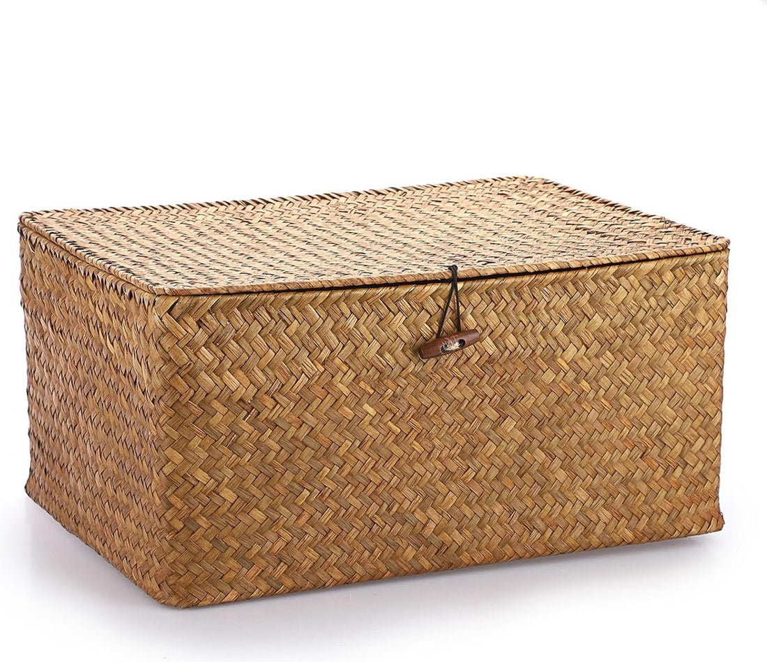 Zeegras opbergmand met deksel Geweven rieten mand Bureaumand Rechthoekige badkamer opbergdoos, woonkamer decoratief onder plankmand Multifunctionele opbergmand (XL,