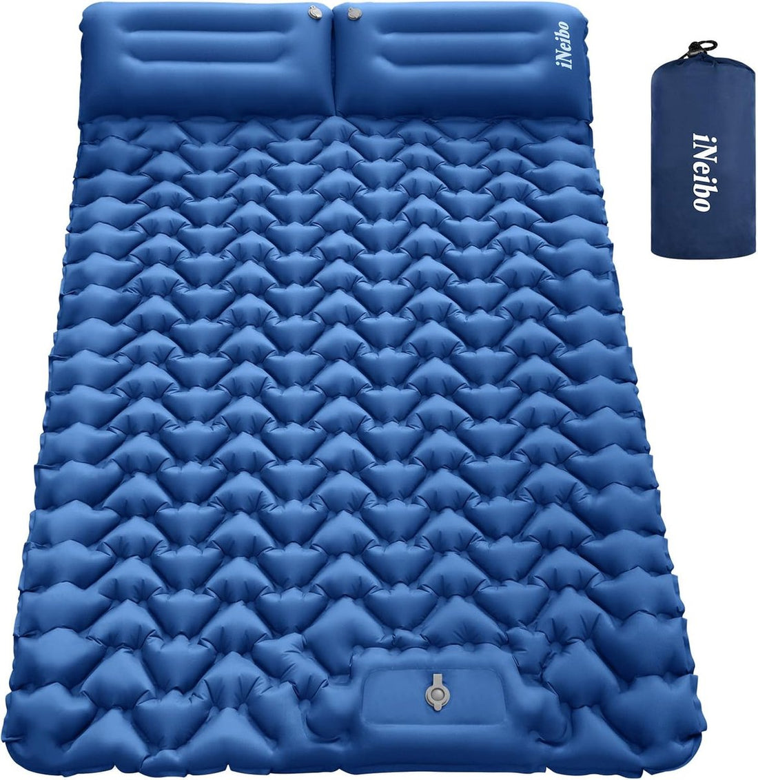 Zelfopblazende slaapmat, 2 personen, luchtmatras voor buiten, zelfopblazend met voetperspomp en kussen, campingmatras voor 2 personen, voor buiten, wandelen, strand en kamperen, blauw