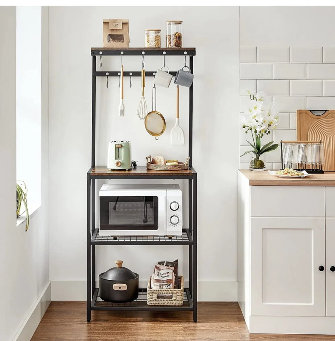 VASAGLE KKS021B01 Keukenplank met planken, magnetronplank met 12 haken en metalen frame, industrieel ontwerp, voor magnetron, kookgerei, 60 x 40 x 151,5 cm, vintage bruin/zwart