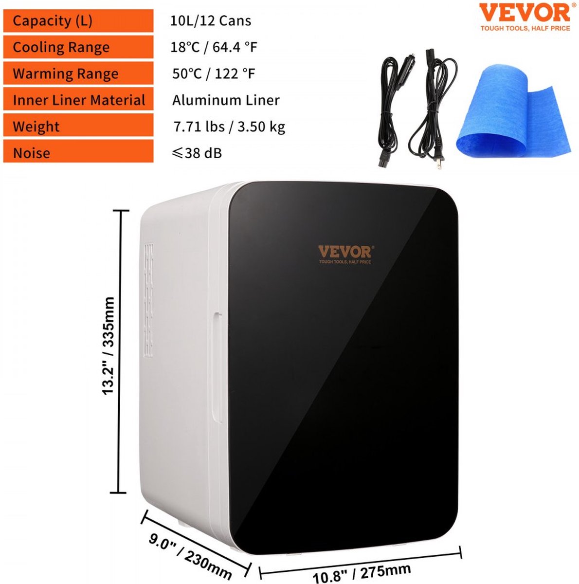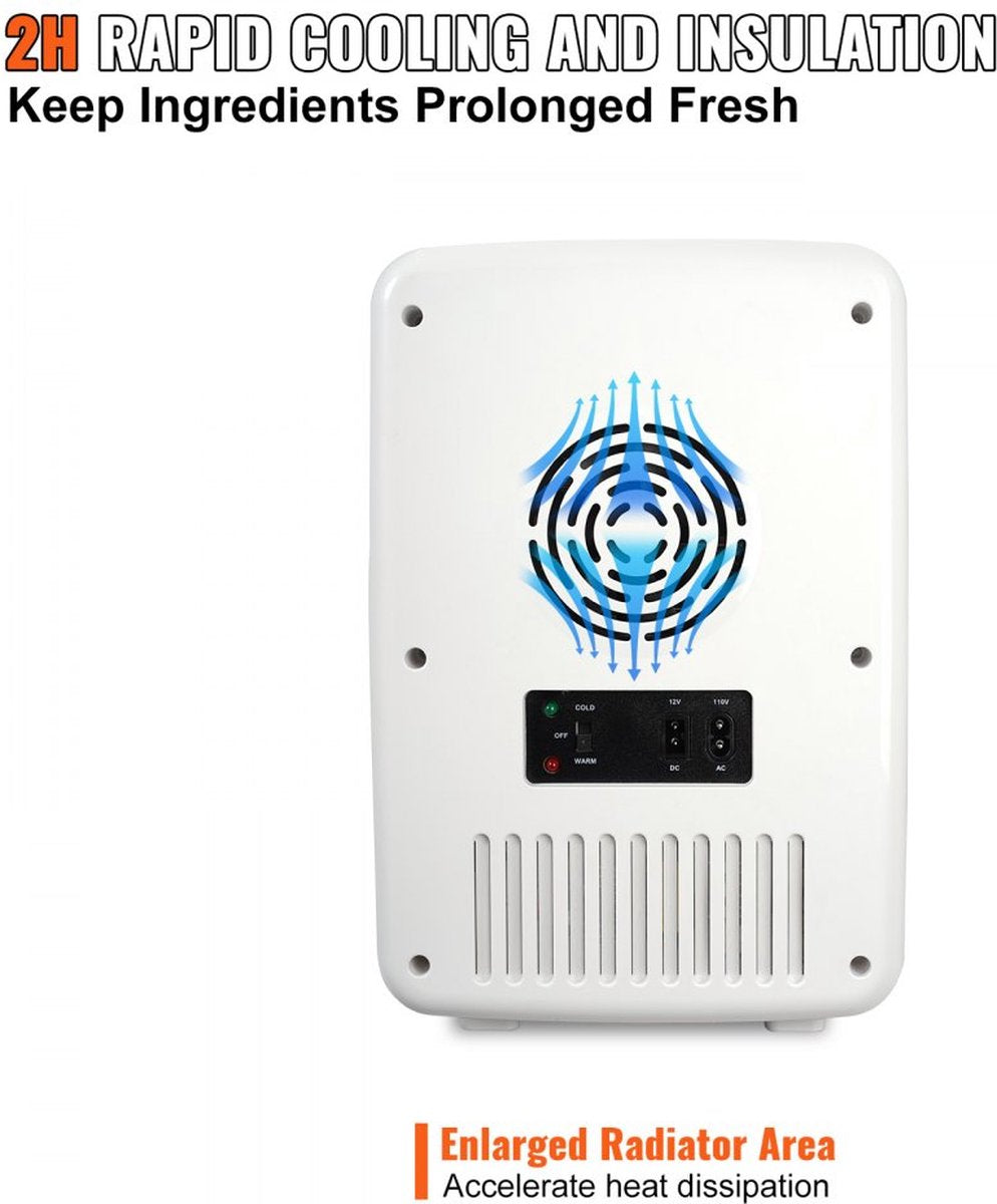 Koelen en verwarmen: onze minikoelkast heeft zowel koel- als verwarmingsfuncties, zodat u de gewenste temperatuur kunt instellen. In de koelmodus kan het een omgevingstemperatuur bereiken van minder dan 64,4 °F / 18 ℃, terwijl het in de verwarmingsmodus een omgevingstemperatuur kan bereiken van maximaal 122 °F / 50 ℃. Het bijbehorende verkoelende effect wordt bereikt in slechts 1,5 uur.Gebruiksvriendelijk ontwerp: geen angst meer voor waterlekken! We hebben onze draagbare koelkast uitgerust met een wateropvangbak onderin de koelkast om de condensatie in de koelkast op te vangen. Een handdoek om overtollig condens op te vegen is ook inbegrepen. Vergeet niet het opgevangen water regelmatig af te tappen om je koelkast schoon en droog te houden.Stille werking: dankzij de geavanceerde ruisonderdrukkingstechnologie werkt de koelkast met een geluidsniveau van minder dan 38 dB, waardoor hij stiller is en minder storend voor uw werk en dagelijks leven. Het verstoort uw rust niet en past perfect in elke omgeving - of het nu een slaapkamer, kantoor of kinderkamer is.COMPACT MAAR RUIM: Onze minikoelkast heeft een kleine behuizing, maar biedt plaats aan twaalf blikken van 330 ml in het vat van 10 liter en weegt slechts 3,5 kg. Aan beide zijden zitten handgrepen, waardoor hij gemakkelijk te dragen is, ideaal voor het bewaren van eten, drinken, moedermelk, huidverzorgingsproducten, medicijnen en nog veel meer.Veelzijdig en handig: de persoonlijke koelkast wordt geleverd met een 12V DC-autonetsnoer en een stroomadapter voor thuis, waardoor hij geschikt is voor gebruik in de auto en buitenactiviteiten. Het gestroomlijnde ontwerp en de handige functies maken het ook tot een ideaal cadeau voor vrienden en familie die van wandelen, picknicken of kamperen houden.