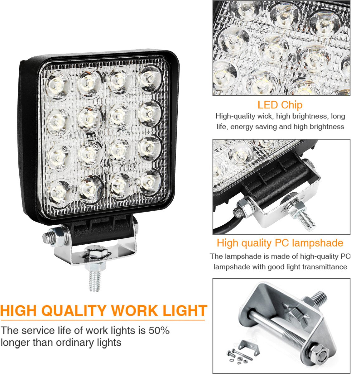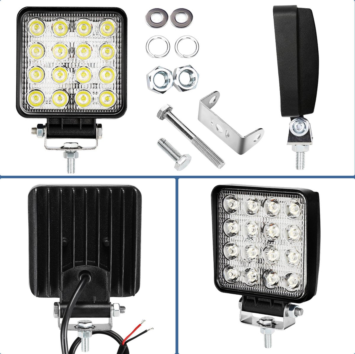 Specificaties van het LED-werklicht: 48W vermogen, LED-vermogen: 16x3W, kleurtemperatuur: 6500K, spanning: 10-30V DC.