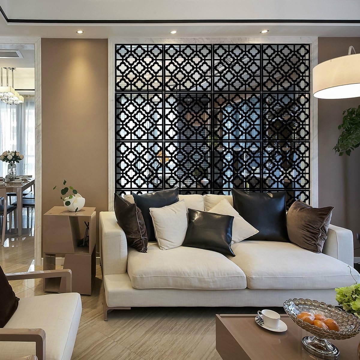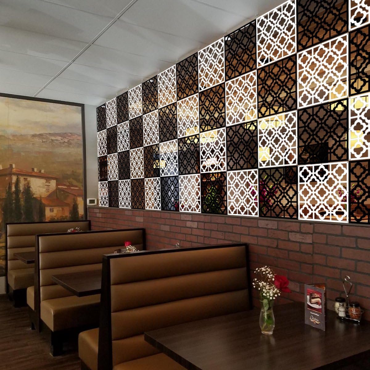 Multifunctioneel: de ruimteverdeler is niet alleen een ruimteverdeler, kan ook je privacy beschermen, maar ook geschikt als decoratief element in ruimtes zoals slaapkamers, eetkamers, woonkamers en kantoor, hotels, bars en school. 【Dun design & eenvoudige montage】 Elk paneel afmetingen: 40 x 40 x 0,1 cm. De verpakkingsinhoud van de ruimteverdeler bevat schroefhulzen, schroeven en verbindingsringen. Hangende One by One door haken en schroeven te monteren en te installeren. Natuurlijke stijl en grilldesign: het eenvoudige en modieuze snijpatroon maakt je kamer er mooier uit. Het uitgeholde patroon past perfect bij moderne interieurs. Hoogwaardige materialen: de panelen van het paneel bestaan uit veilig PP-materiaal en zijn niet giftig en veilig voor de gezondheid. Het kan worden gewassen en wordt als nieuw.