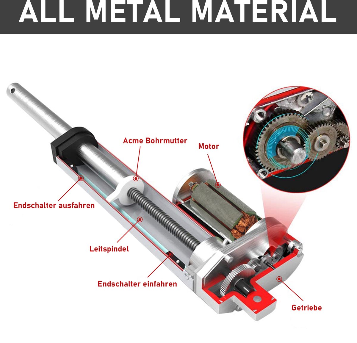 De duwstang wordt aangedreven door een gelijkstroommotor met wormwielaandrijving. De telescoopstang kan alleen worden ingetrokken zonder te draaien.