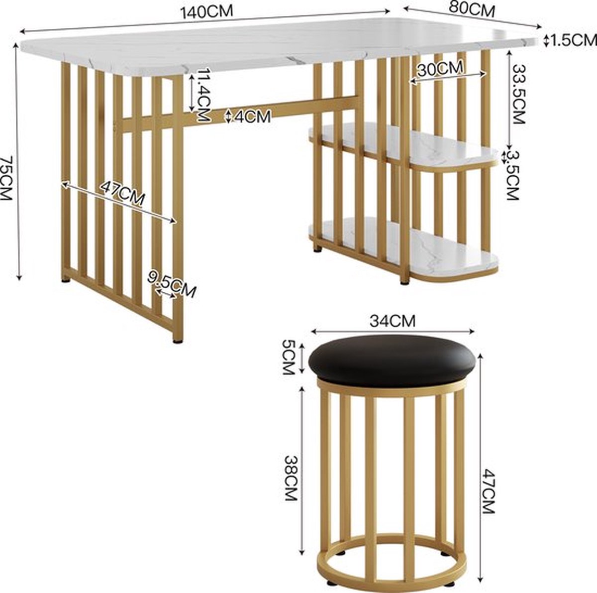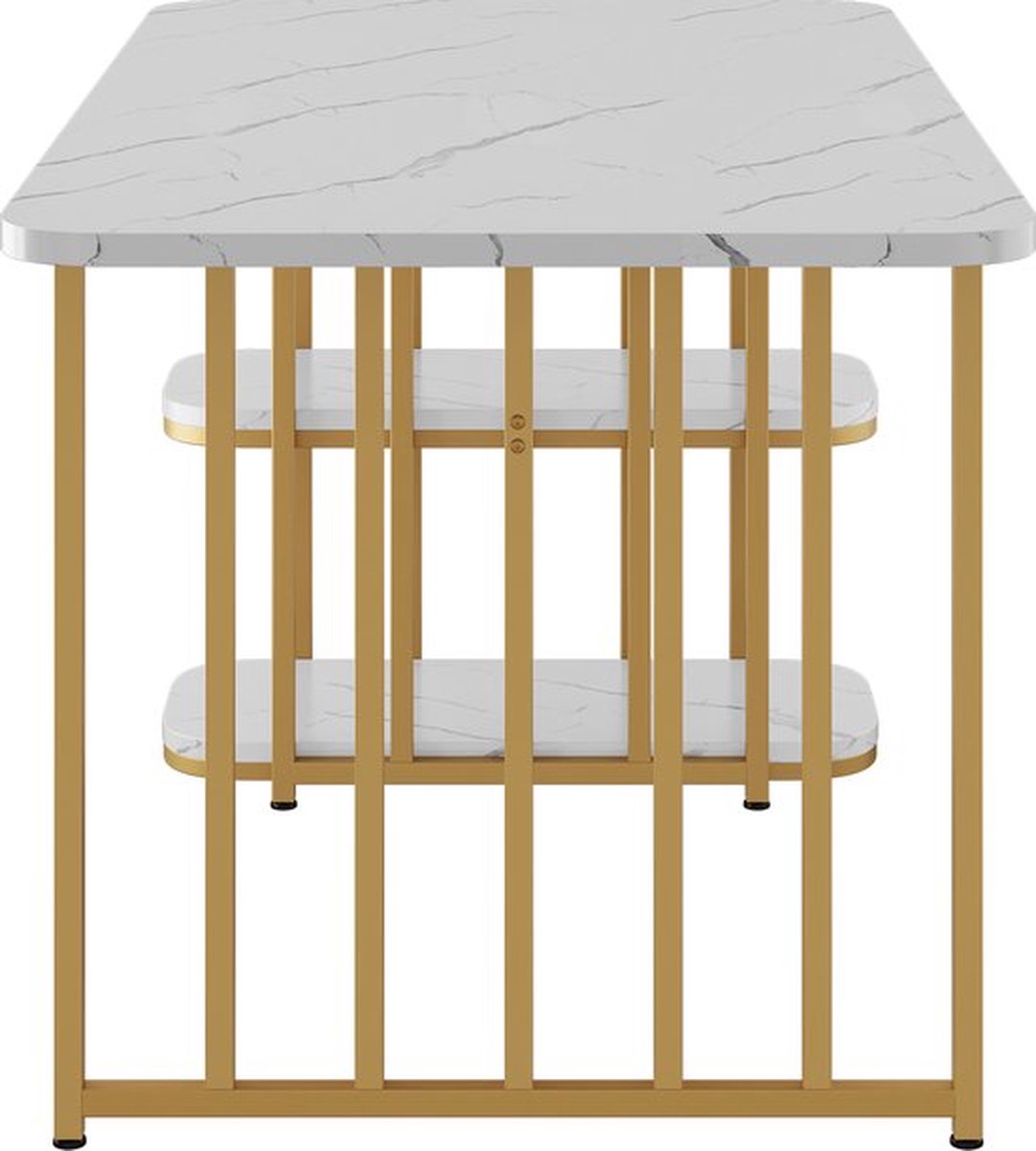 - Modern en modieus design: het rechthoekige bureau combineert wit en goud voor een stijlvolle en moderne uitstraling. Dit ontwerp kan niet alleen het algemene decoratieeffect van de kamer verbeteren, maar ook verschillende interieurstijlen aanvullen en uw huis unieke charme geven.