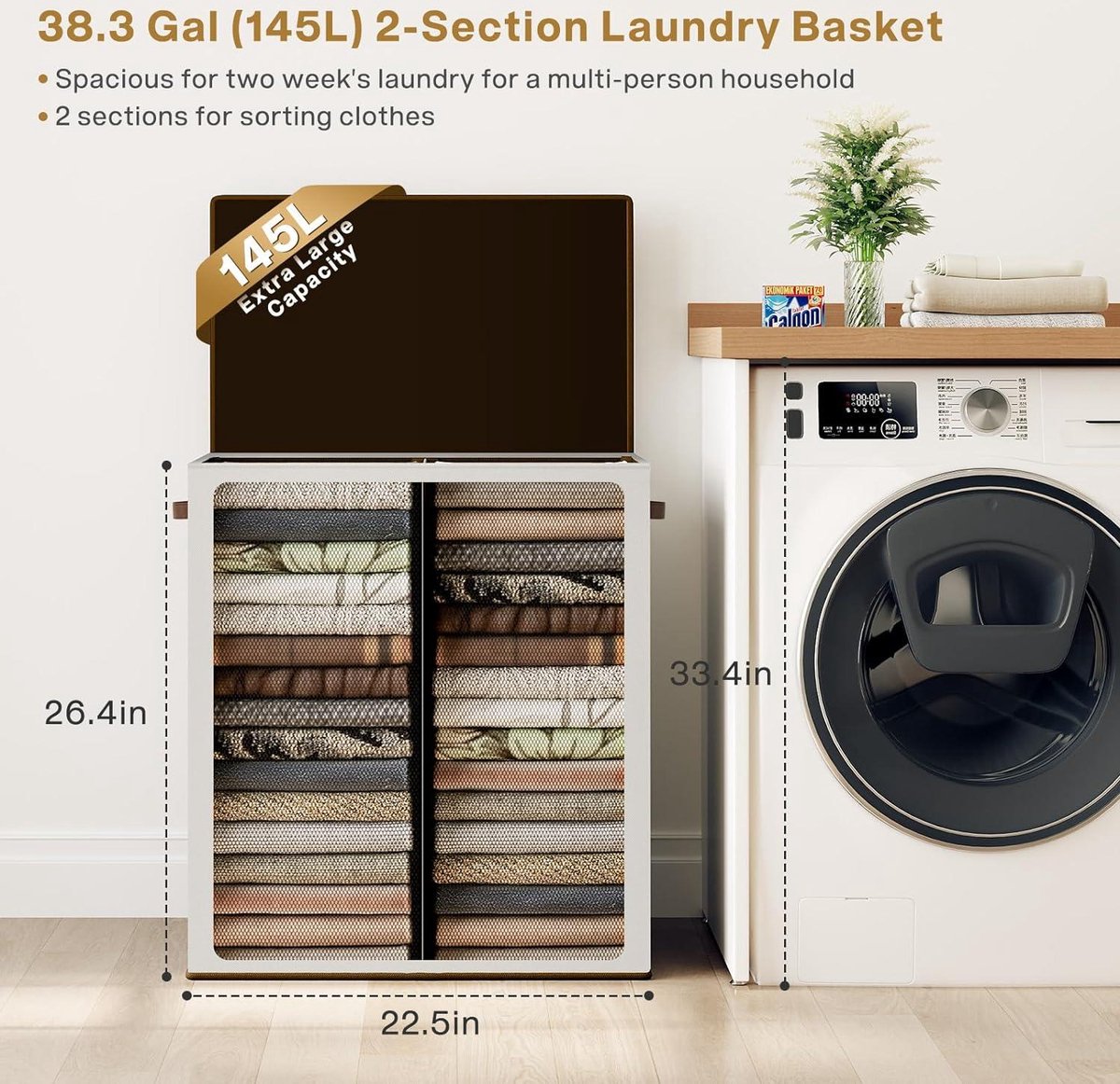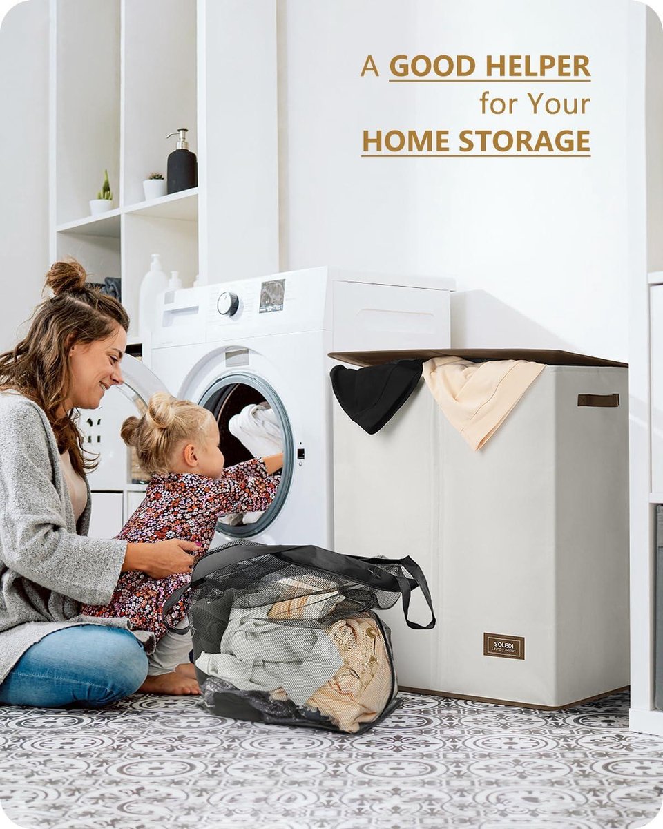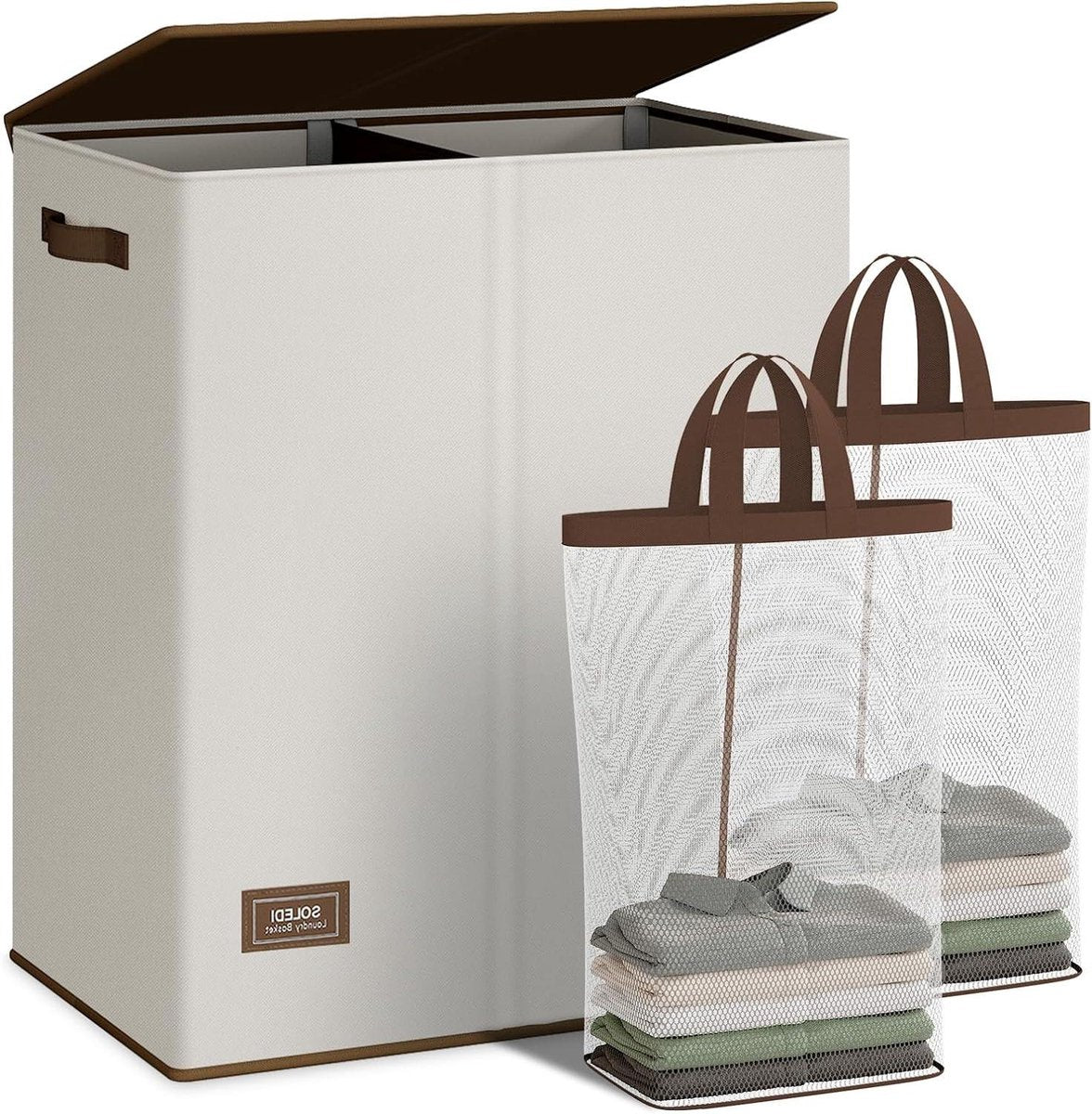 145L dubbele wasmand met deksel en verwijderbare waszakken - wit - grote capaciteit, opbergoplossing