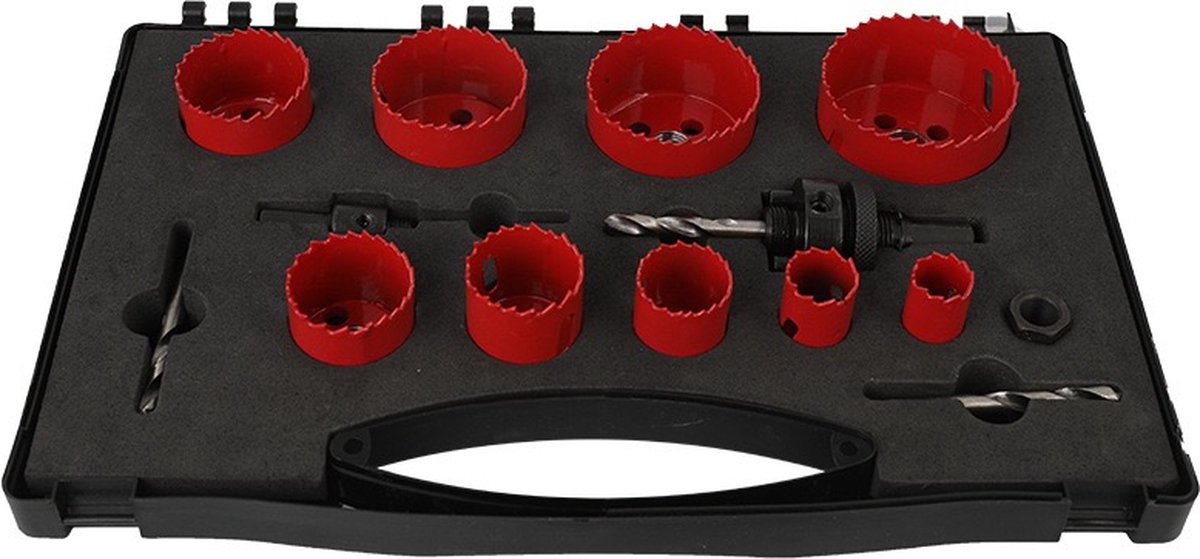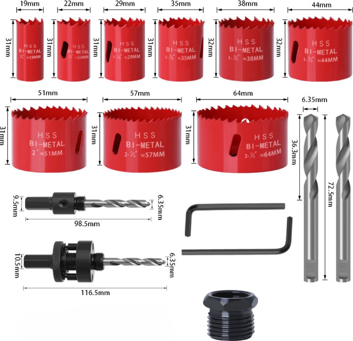 Deze 16-delige dozenboorset bestaat uit 9 dozenboren van ø 19mm, ø22mm, ø29mm, ø35mm, ø38mm, ø44mm, ø51mm, ø57mm en ø64mm en bijbehorende accessoires. Deze boren zijn gemaakt van HSS waardoor het ideaal is voor het boren van gaten in verschillende materialen zoals hout, kunststof, aluminium, PVC, ijzer en gipsplaat. Met de centreerboor kunt u gemakkelijk het middelpunt van het te boren gat te bepalen.