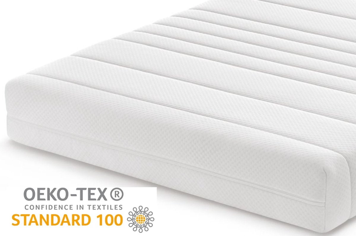 Wil je luxe en comfortabel matras voor je kind wat zonder problemen jaren meekan? Kies dan dit matras met een luxe wasbare tijk. Dit matras heeft een 3 zijdes afritsbare dubbeldoeks tijk met 200gram Dacron vulling. Een comfortabele en luxe tijk die gewassen kan worden op 30 graden (huisstofmijt dodend). Dit matras is in Nederland gemaakt en voldoet aan alle veiligheidseisen. De gouden combinatie tussen de tijk en een soepele hoogwaardige koudschuimkern maakt dit matras een absolute topper! Waar moet je op letten bij de aanschaf van een kindermatras? - Een kindermatras moet vrij zijn van schadelijke stoffen - Een kindermatras moet veerkrachtig zijn en goede ondersteuning bieden - Een kindermatras mag niet te warm worden en moet goed ventileren - Een kindermatras mag niet zacht zijn maar moet ook zeker niet keihard zijn - Voor kinderen t/m 12 jaar is het niet aan te raden om op een matras met zones te slapen. Dit omdat ze nog niet lang genoeg zijn om de zones te benutten, waardoor ze helemaal verkeerd in de zones kunnen liggen - Het matras moet droog en hygiënisch zijn (en het liefst met een afritsbare anti-allergische hoes/tijk die je kan wassen) - Het matras moet het liefst lang meegaan (kinderen zijn al duur genoeg) Voordelen van dit matras -100% veilig product, dit matras is gemaakt in Nederland en voldoet aan alle Europese veiligheidseisen ( Ökotex100-norm). -Medium ligcomfort en geen zones (perfect voor kinderen in de groei). -Koudschuim heeft een open celstructuur, dit zorgt voor een goede vochtregulatie en een droog en koel slaapklimaat (hierdoor is het veel hygiënischer dan andere type matrasssen). Vooral de combinatie met een Cooltouch tijk is dit een absolute topper. -Blijvend veerkrachtig, langdurig en hoogwaardig ligcomfort. Kuilvorming komt niet voor bij koudschuimmatrassen. Hierdoor heeft het een zeer lange levensduur (in tegenstelling tot goedkopere polyether of pocketveermatrassen). -Koudschuim heeft een hoog corrigerend vermogen (het lichaam krijgt overal voldoende ondersteuning). -De hoes/tijk is afritsbaar en wasbaar (goede hygiëne) Specificaties -Schuim: gecertificeerd koudschuim HR 45 -Belastbaar tot 90kg (geen probleem als papa of mama bij je komt liggen) -Anti-allergisch, anti-huisstofmijt -Vrij van schadelijke gassen (CFK) -Hoes/tijk: Cooltouch, 200 grams Dacron dubbeldoek wasbaar op 30 graden (huisstofmijtdodend) -Dikte: circa 14cm