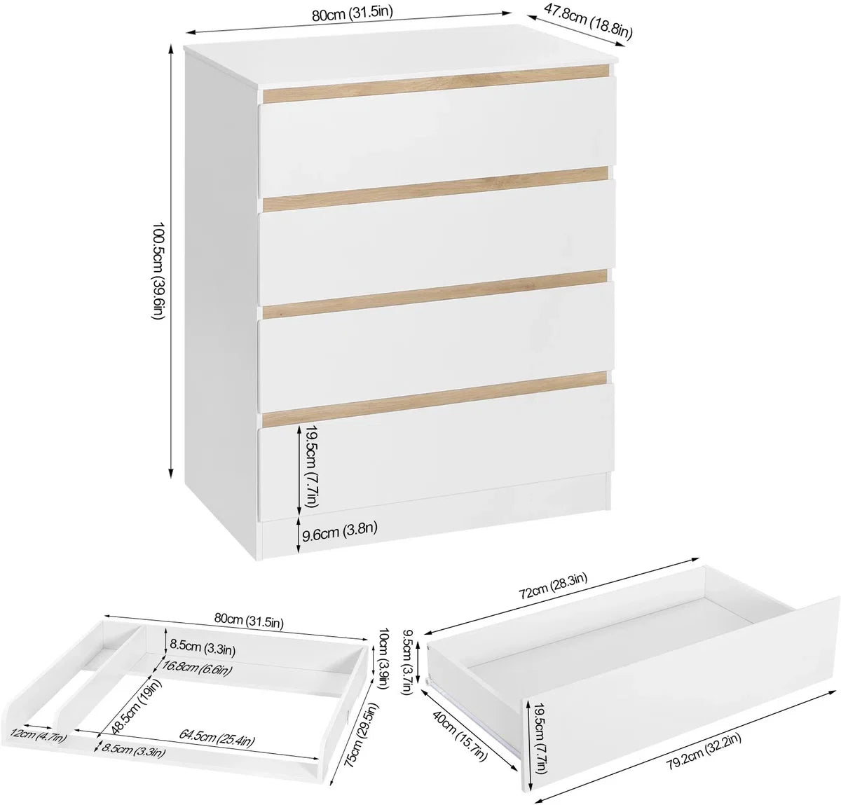 Royale Afmetingen: De commode meet 80 cm x 109,2 cm x 75 cm (B x H x D), terwijl elke lade 72 cm x 9,5 cm x 40 cm (B x H x D) meet. Het werkoppervlak kan tot 30 kg dragen, en elke lade heeft een laadvermogen van 10 kg.