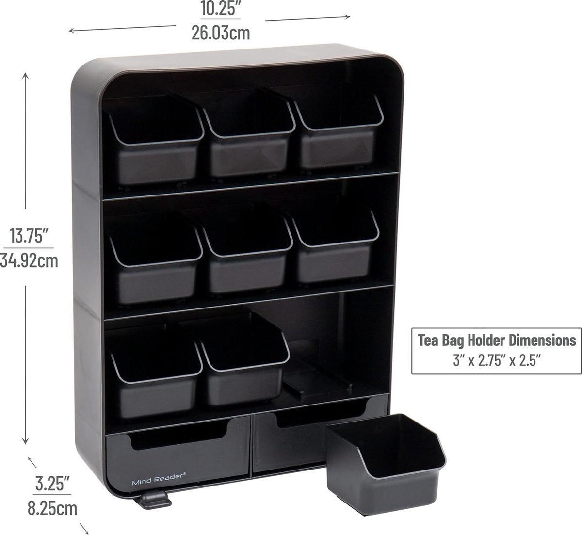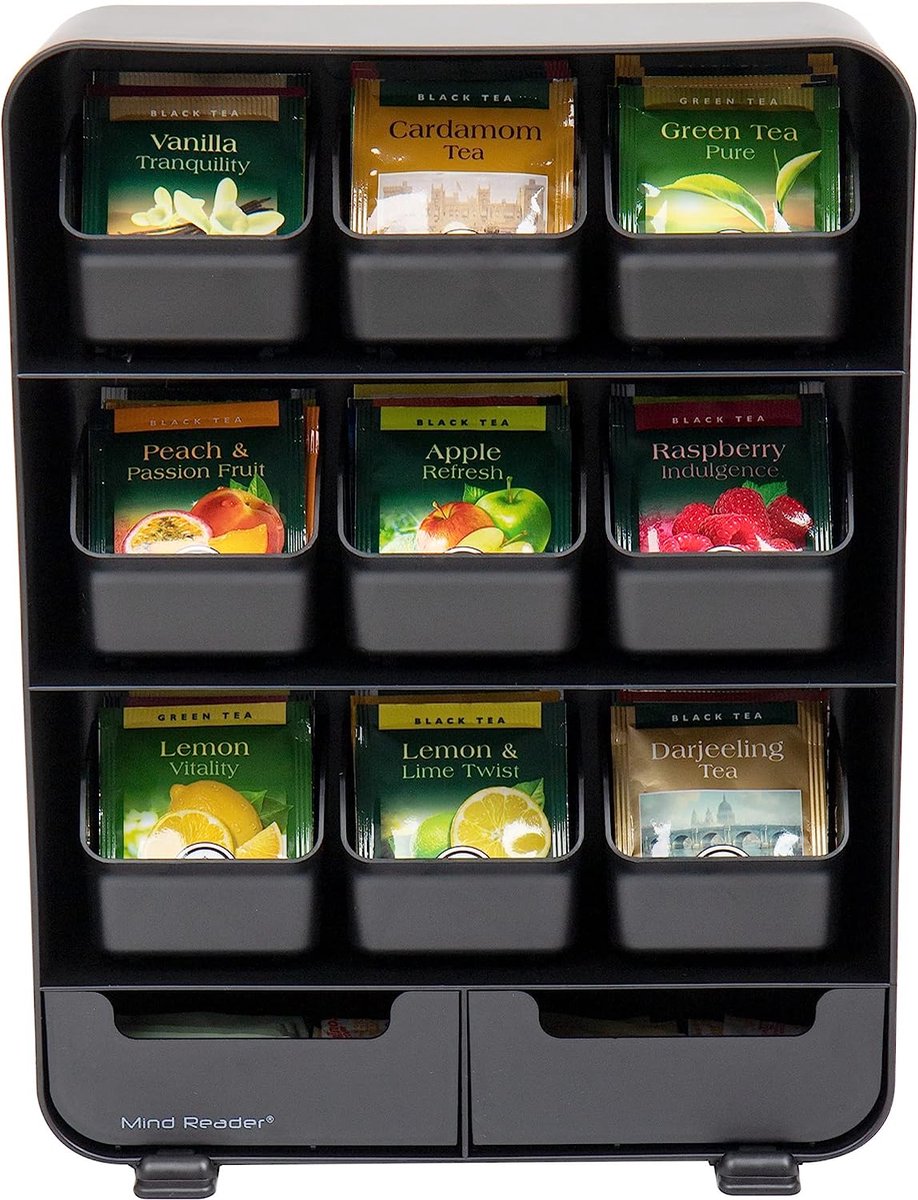 Compacte organizer verwijdert de rommel van theedozen en bespaart ruimte - Past in alle keukenkasten - Staat overal op het aanrecht of op tafels voor eenvoudige weergave - Lichtgewicht apparaat zorgt voor eenvoudige veelzijdigheid bij het ontvangen van entertainment Schuif en verwijder elke lade eenvoudig voor gemakkelijke toegang, bekijken en selecteren van thee Geen montage nodig - Duurzaam plastic is eenvoudig schoon te maken met een vochtige doek Ondiepe ladeopslag voor specerijen en theeaccessoires
