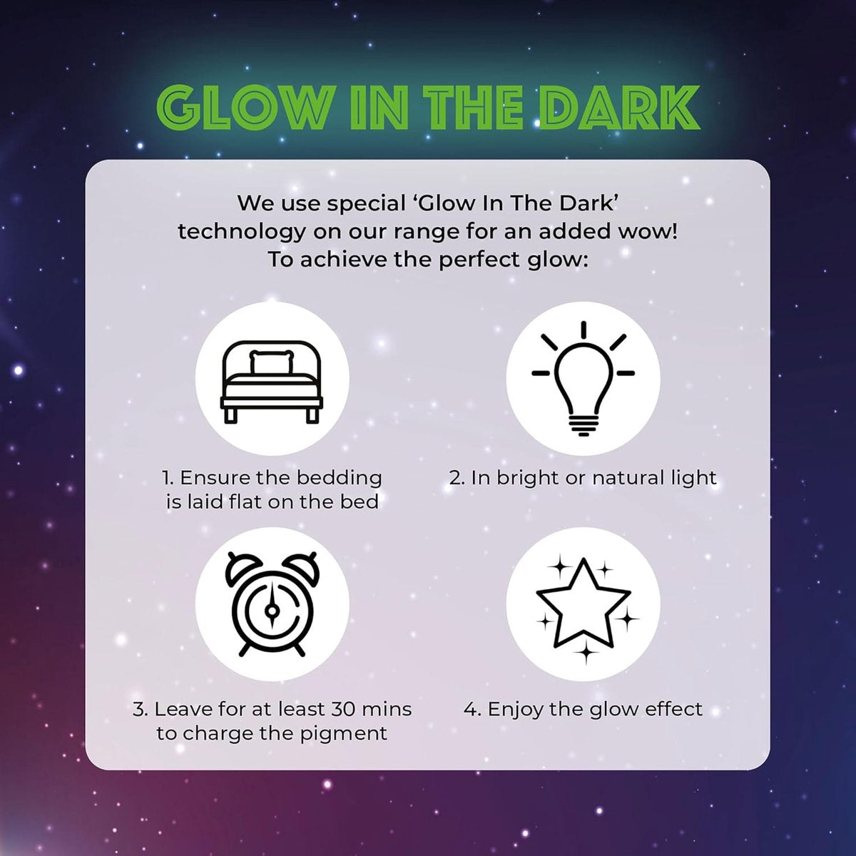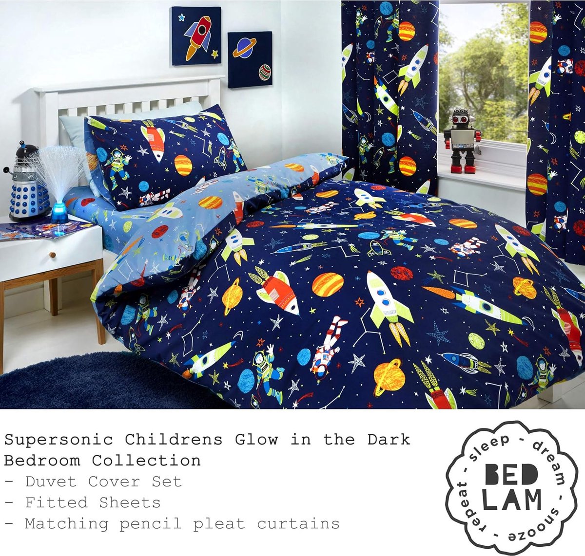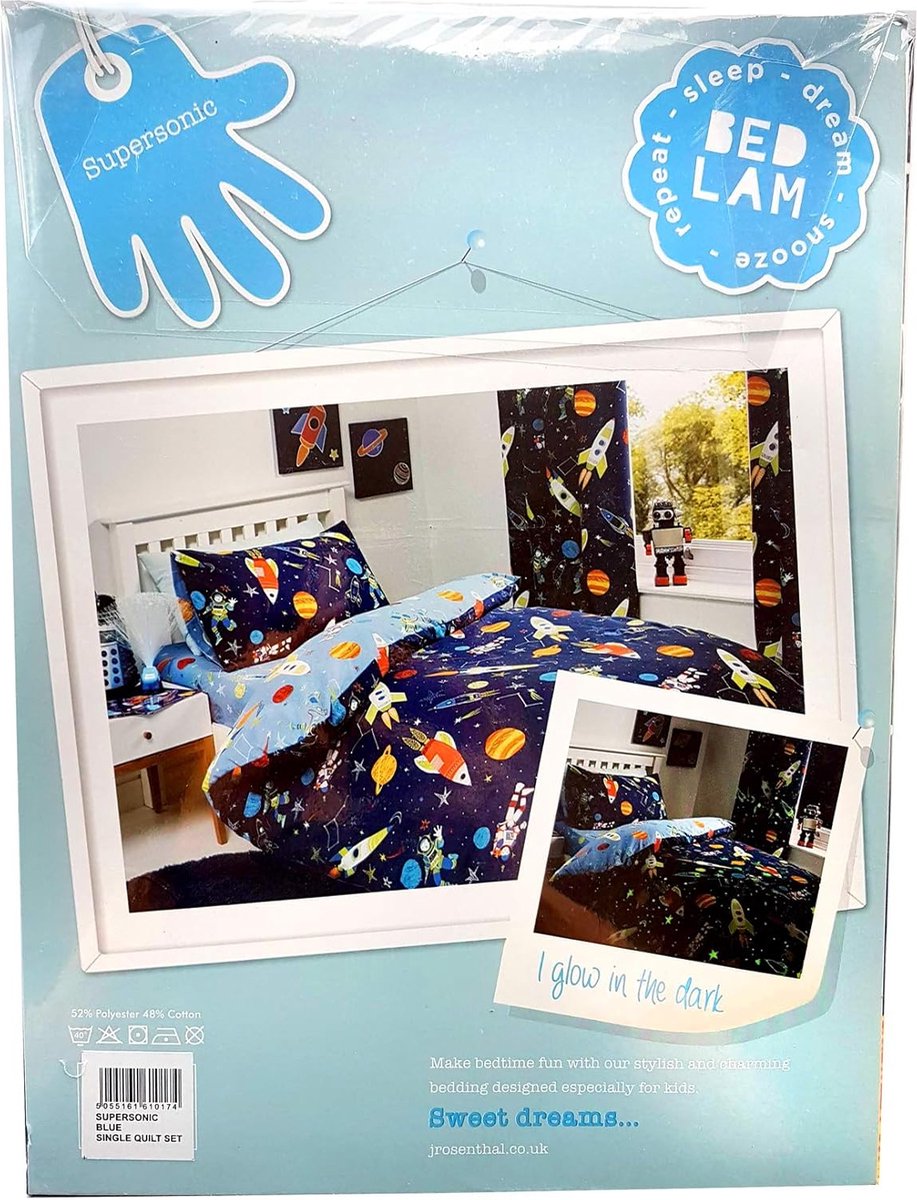 - Rocket Into Space en Float onder de sterren en planeten met deze fantastische en leuke beddengoedcollectie. Het beddengoed en de gordijnen hebben een prachtige glow in the dark functie, die gegarandeerd een glimlach brengt voor elke jongen een astronautengezicht.