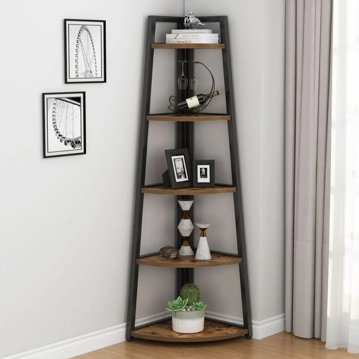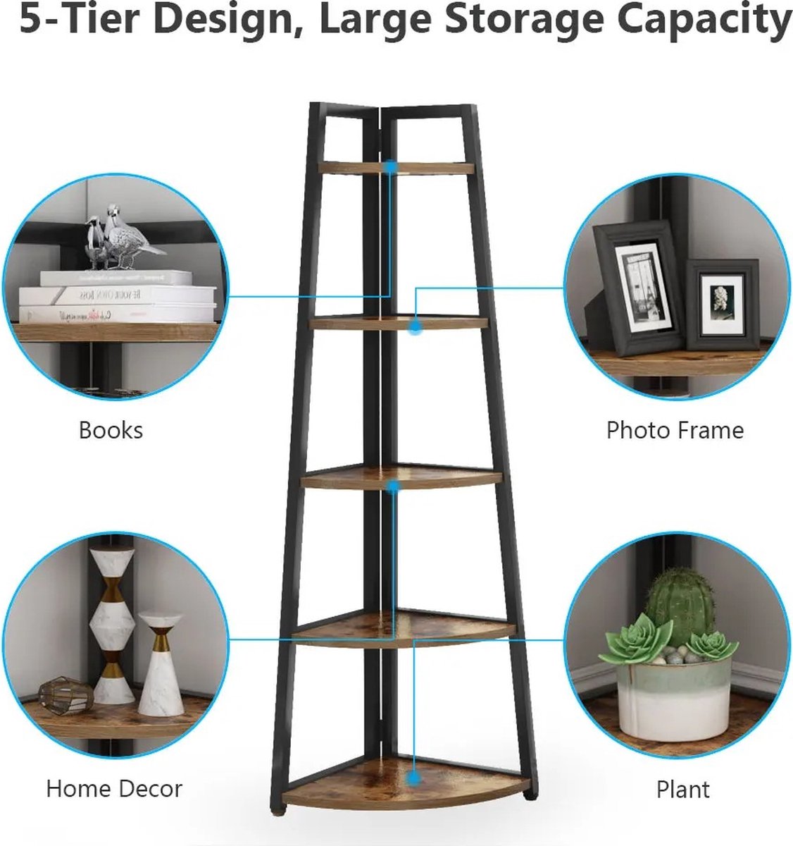 Breng stijl en functionaliteit samen met deze elegante hoekboekenkast, ontworpen om perfect in elke hoek van je huis te passen. Dit boekenrek combineert een robuust metalen frame met rustieke houten planken, waardoor het een perfecte aanvulling is op zowel moderne als klassieke interieurs.