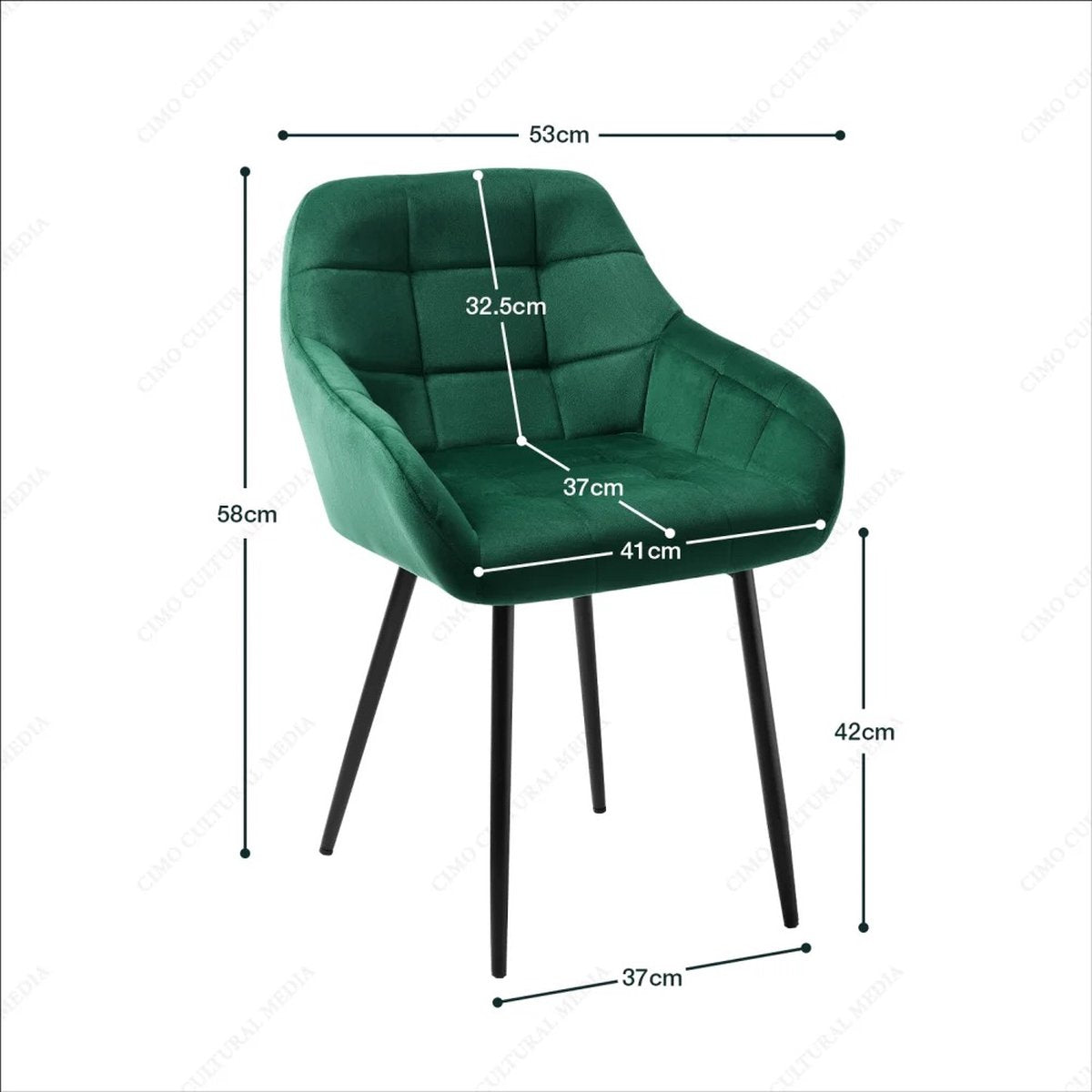 Elke stoel is zorgvuldig gestoffeerd met fluweel dat een rijke, luxe uitstraling geeft en tegelijkertijd zacht aanvoelt. De zwarte poten vormen een strak contrast met de groene bekleding en zorgen voor een stevige en stabiele basis. Het ergonomische ontwerp met armleuningen biedt extra ondersteuning, waardoor je urenlang comfortabel kunt zitten.