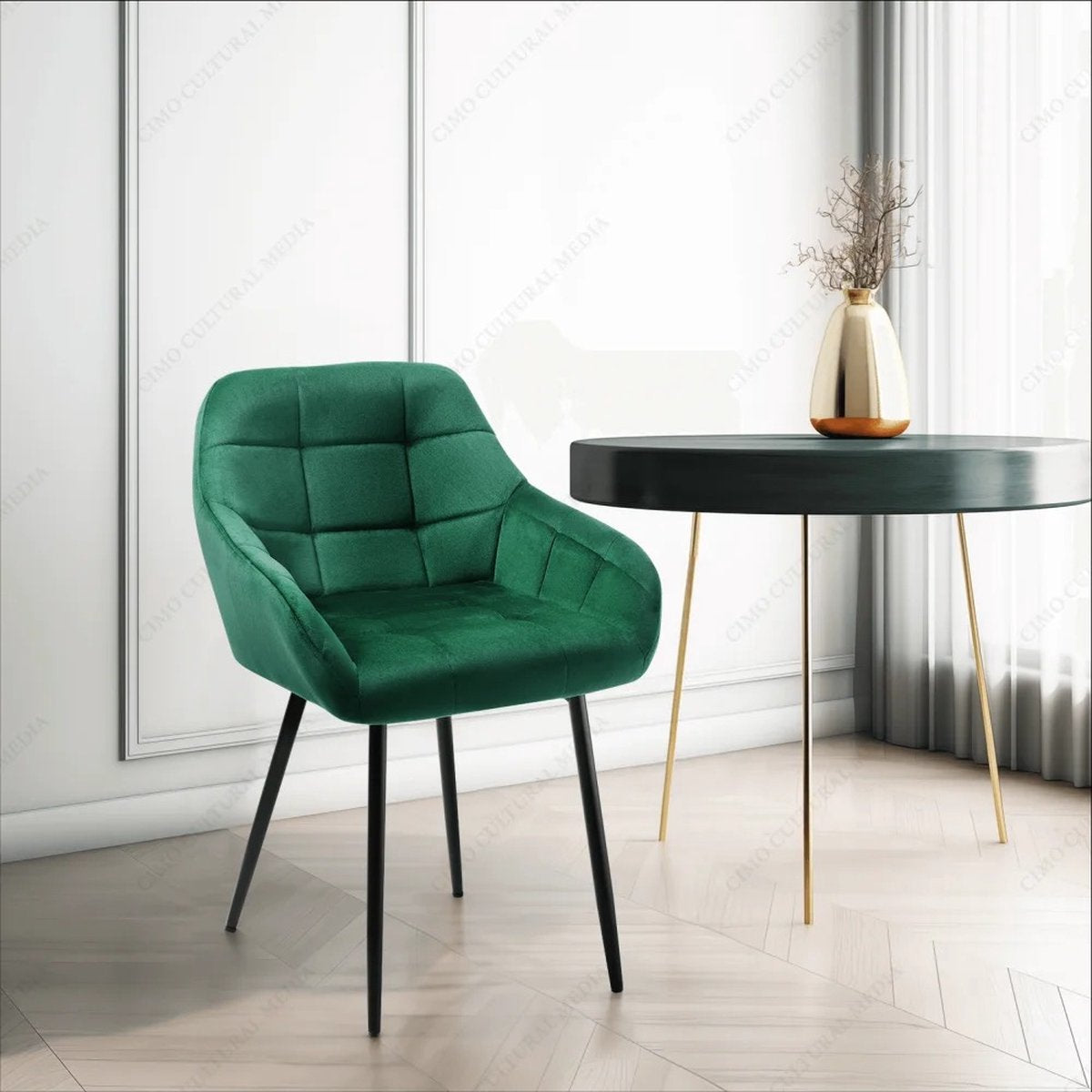 Til je eetkamer naar een hoger niveau met deze set van 4 stijlvolle eetkamerstoelen, bekleed met fluweel in een prachtige groene tint. Deze stoelen combineren modern design met ultiem comfort, en zijn een echte blikvanger in elke ruimte. Perfect voor zowel formele diners als dagelijkse maaltijden, deze stoelen bieden niet alleen een verfijnde uitstraling, maar ook een comfortabele zitervaring dankzij de armleuningen en zachte bekleding.