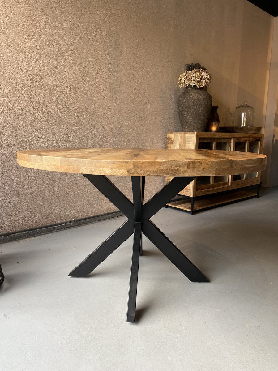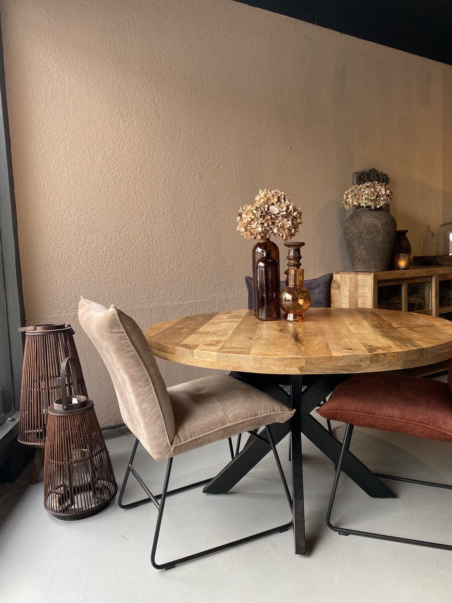 Deze sfeervolle ronde tafel 100 cm van Sfeerwonen enzo is gemaakt van massief mango hout met hieronder zwart stalen spinpoten. Mangohout staat bekend om zijn mooie patronen en levendige en natuurlijke uitstraling. De ronde tafels van mango hout zijn duurzaam, gebruiksvriendelijk en passen perfect in een industrieel interieur.