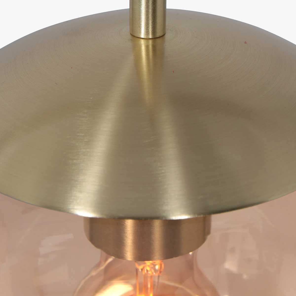 De warme amberkleur van het glas geeft een uitnodigende en gezellige sfeer, terwijl de ronde plafondbevestiging een moderne en strakke uitstraling geeft.