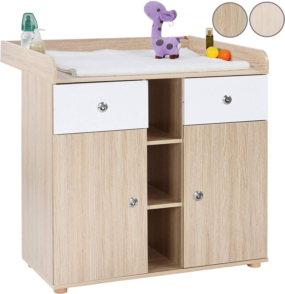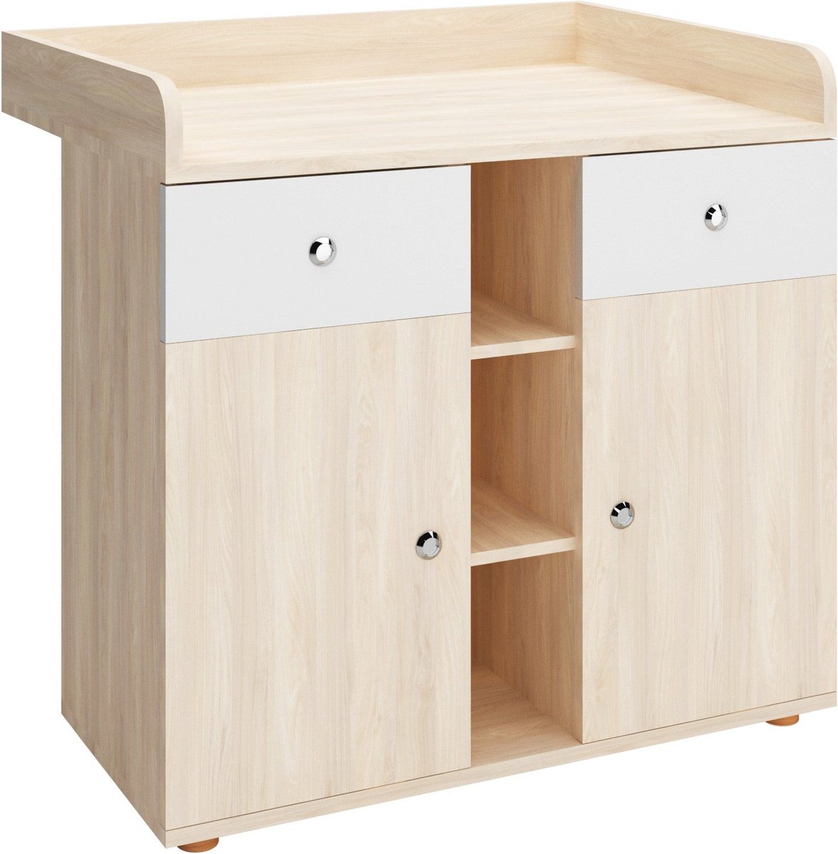 Eenvoudig ontwerp en veel opbergruimte vormen de moderne commode. In twee lades, twee kasten en drie open vakken is ruimte voor luiers, kleding, verzorgingsproducten en al het andere dat altijd bij de hand moet zijn bij het dagelijks verschonen van luiers. Luiers kunnen comfortabel verschoond worden op de ruime verschoonruimte. De vriendelijke houttinten passen in iedere kinderkamer en zijn te combineren met een grote verscheidenheid aan meubelen.