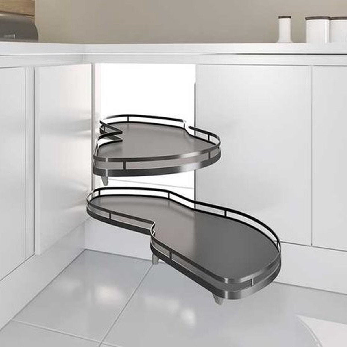 Deze kast heeft een uniek design en is uitgevoerd in de kleur antraciet met hoogwaardige afwerking. De draaibodems hebben een draairichting naar rechts en beschikken over een zachte, vertraagde sluiting, die de kast beschermd tegen beschadigen. Dankzij dit systeem kun je alles halen uit de ruimte in je hoekkasten, zonder je daarvoor in bochten te hoeven wringen.