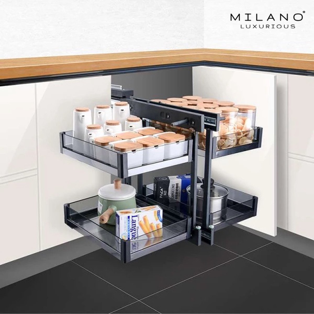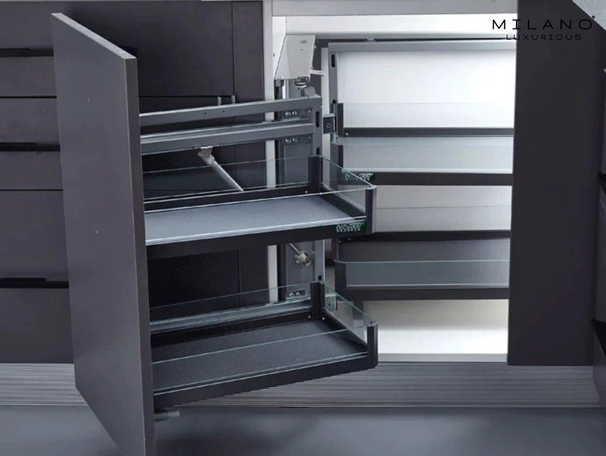 De Milano Luxurious® opberglades bieden de mogelijkheid om op een efficiënte en slimme wijze met opbergruimtes om te gaan. Door middel van het slimme en ergonomische systeem kan je de hoekkast volledig benutten. Dit lade-systeem is de ideale oplossing voor het optimaal benutten van de hoekkasten in je keuken.