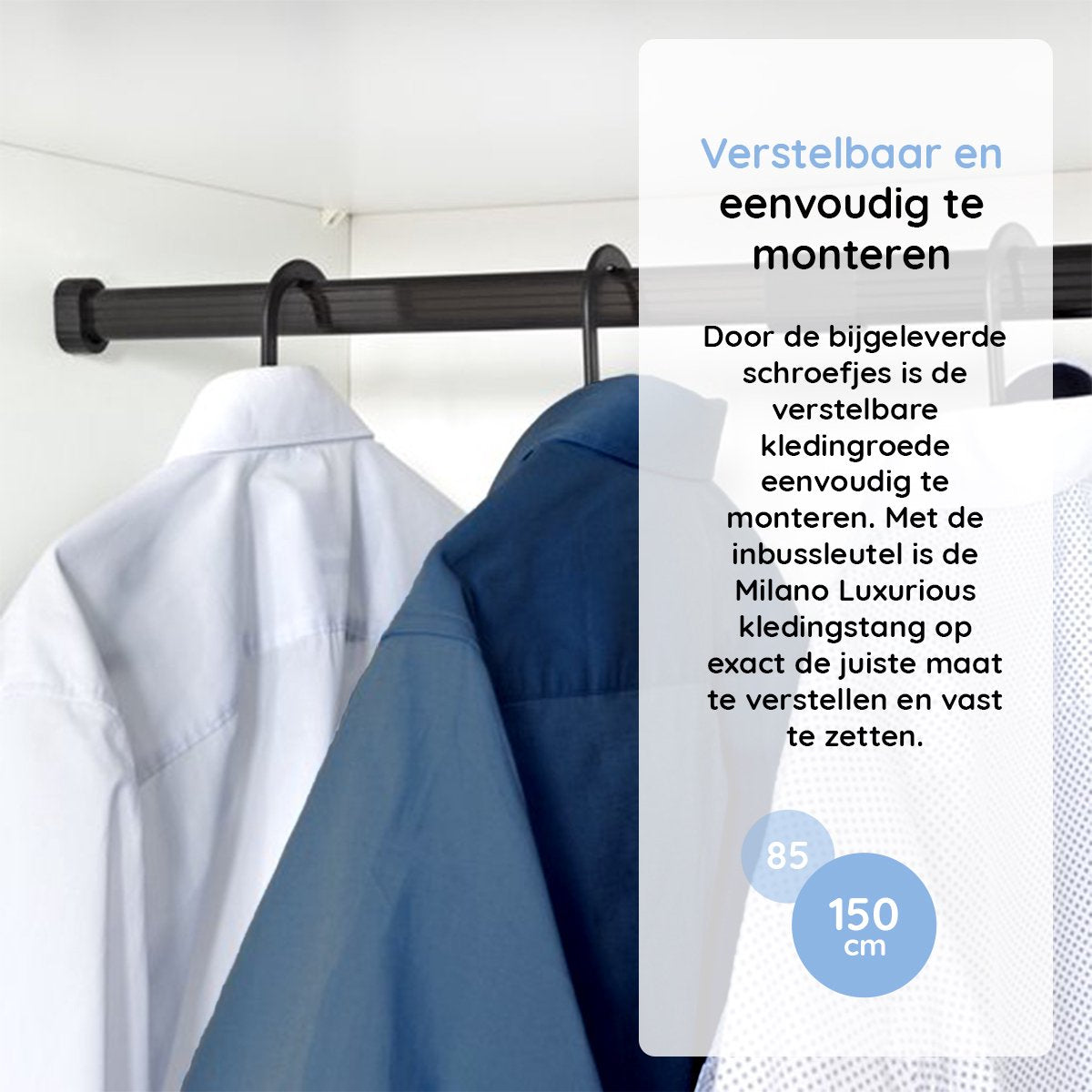 De kledingroede is zeer gebruiksvriendelijk en werkt ruimtebesparend met een luxe uitstraling. De uittrekbare kledingstang van het merk Milano Luxurious is gemaakt van stevig zwart aluminium dat licht van gewicht is. De kledingroede is eenvoudig te fixeren met behulp van de meegeleverde inbussleutel en is verstelbaar in verschillende maten. Je kan de uiteinden van de kledingstang dus makkelijk in je kast schroeven. De uittrekbare kledingstang kan worden versteld tussen 85cm en 150cm en is dus exact op maat te maken zonder te hoeven zagen. Door de luxe uitstraling wordt de Milano Luxurious stang ook gebruikt in inloopkasten of als garderobestang voor zware jassen. Vanwege de ovale vorm, het stevige materiaal en de inbusboutjes heeft deze kledingkastroede een groot draagvermogen.