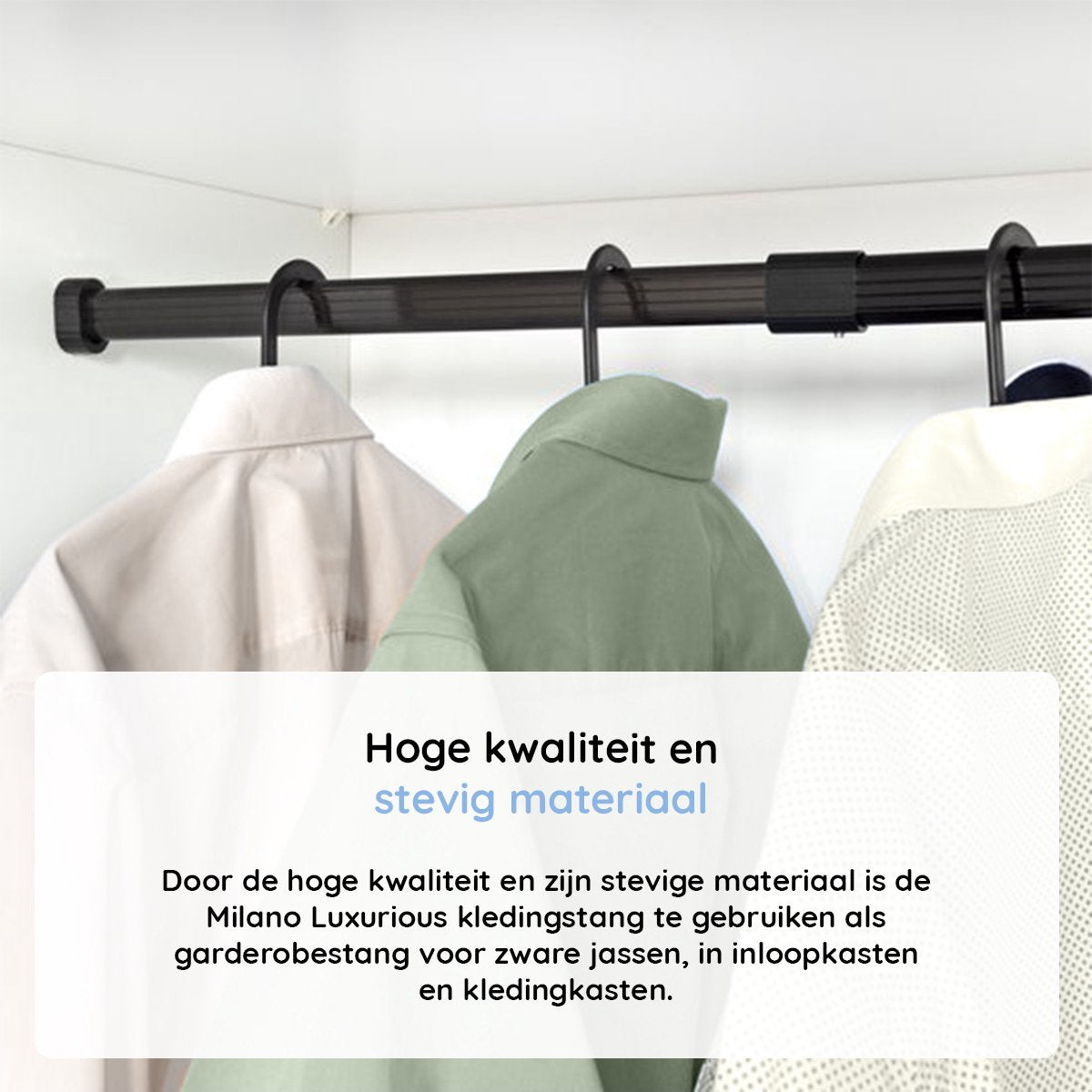 Door de hoge kwaliteit en zijn stevige materiaal is de Milano Luxurious kledingstang te gebruiken als garderobestang voor zware jassen, in inloopkasten en kledingkasten. De roede kan door zijn ovale vorm, hoge kwaliteit en stevige materiaal fungeren als garderobestang voor zware jassen.