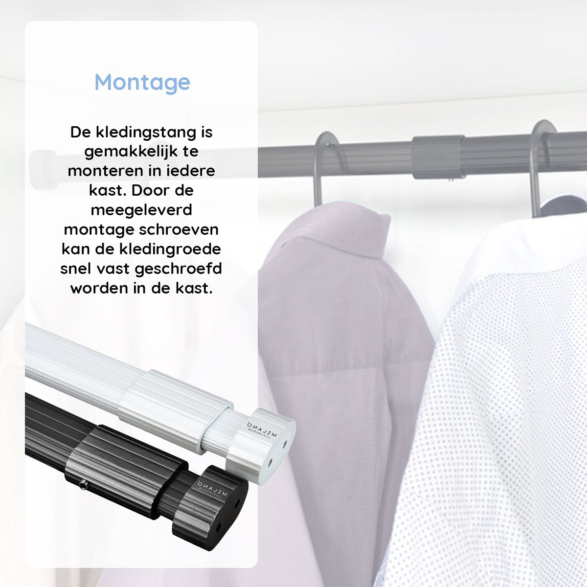 De kledingstang is gemakkelijk te monteren in iedere kast. Door de meegeleverd montage schroeven kan de kledingroede snel vast geschroefd worden in de kast. Let op: de kledingstang van Milano Luxurious is geen klemstang maar wordt gemonteerd met schroeven