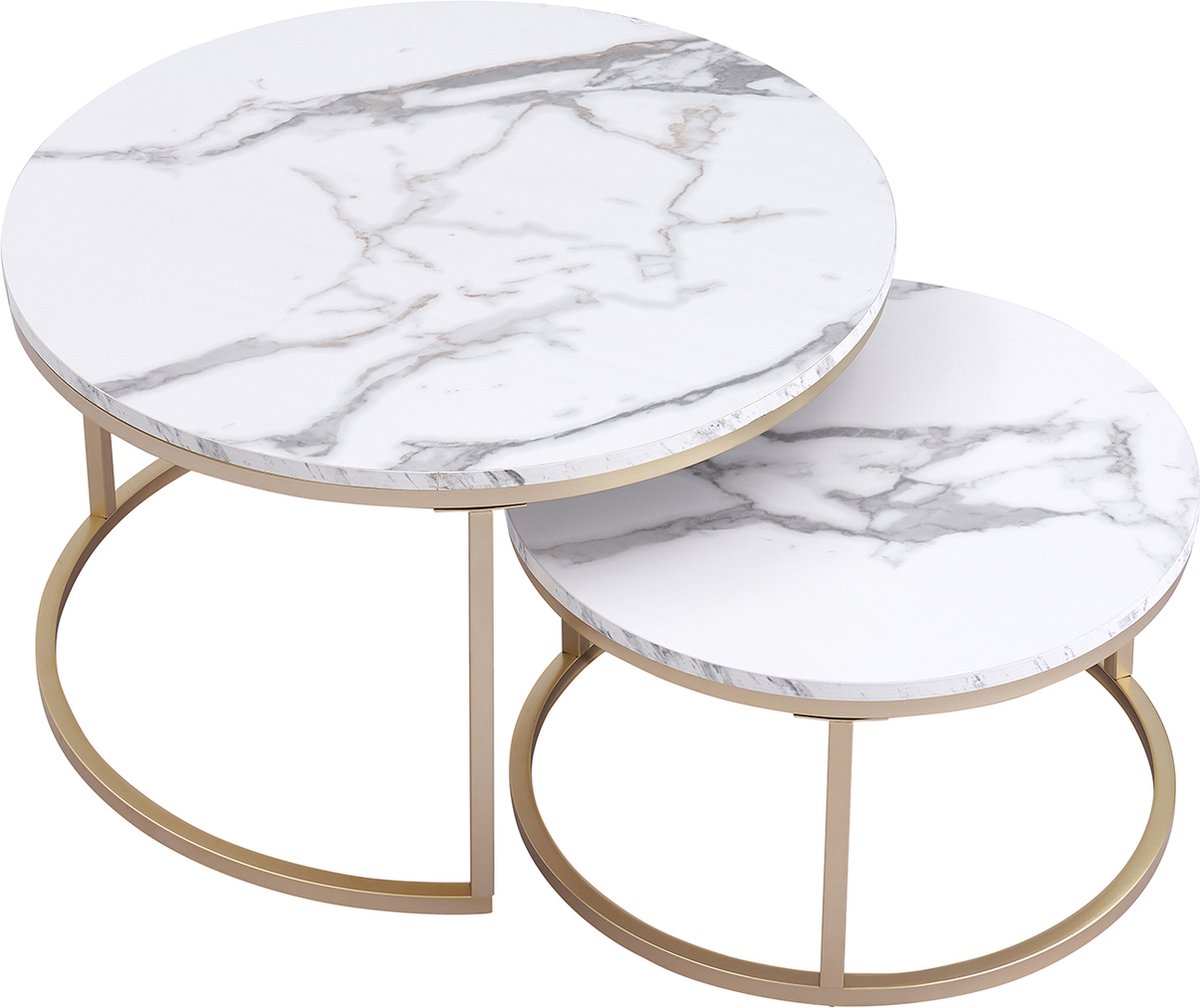 De tafels zijn vervaardigd van hoogwaardig MDF met een marmerlook afwerking, wat zorgt voor een luxe uitstraling zonder het gewicht en de kwetsbaarheid van echt marmer. Het gouden metalen frame biedt niet alleen een stevig en stabiel onderstel, maar voegt ook een vleugje glamour toe aan uw woonruimte. Met afmetingen van Ø80 cm en Ø60 cm, kunnen de tafels samen of apart worden gebruikt, afhankelijk van uw behoefte en ruimte.