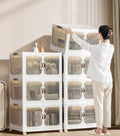 De opbergkast bestaat uit verschillende lagen die overal in huis kan worden geplaatst, van de keuken tot de slaapkamer. Met de meegeleverde wielen zijn ze eenvoudig te verplaatsen. Je kunt de dozen openen via zowel de dubbele voordeuren aan de voorkant als het deksel aan de bovenkant van de kast. Dankzij de magneet aan de voorkant sluiten de deuren moeiteloos.