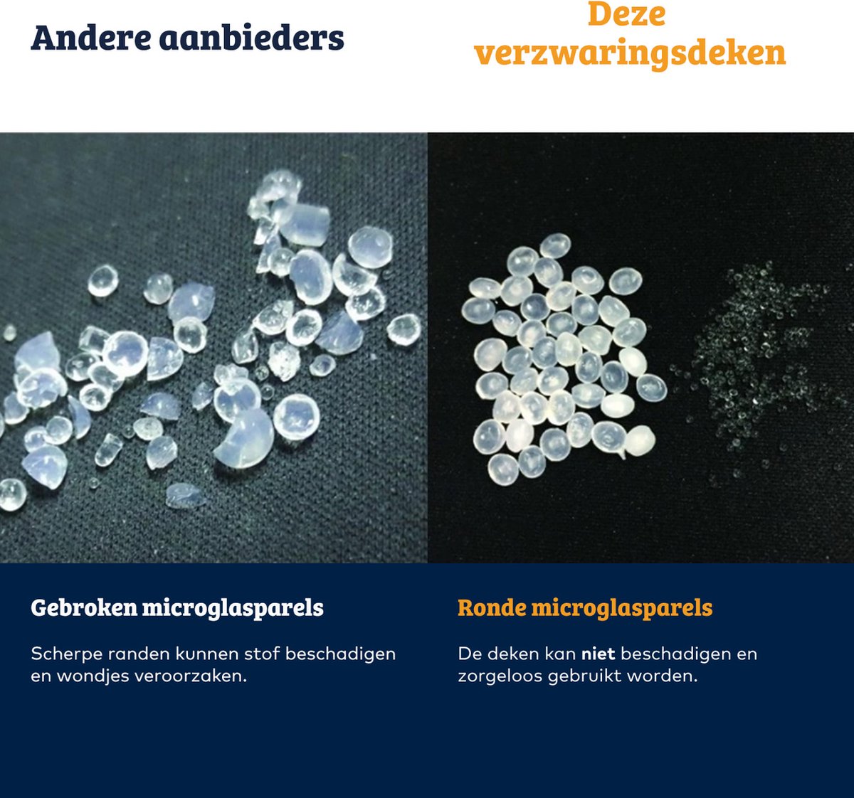 De ontwikkelaar heeft gebruik gemaakt van perfect ronde microglasparels die geen schade kunnen veroorzaken in de verzwaringsdeken en bijdragen aan een goede drukverdeling. Bij merken van mindere kwaliteit gaat het vaak om gebroken of hoekige glasparels of een vulling van ander (inferieur) materiaal. Daarnaast is er een beschermlaag aangebracht op de polyester vulling van de deken, zodat er geen enkele kans is dat de microglasparels kunnen ontsnappen.