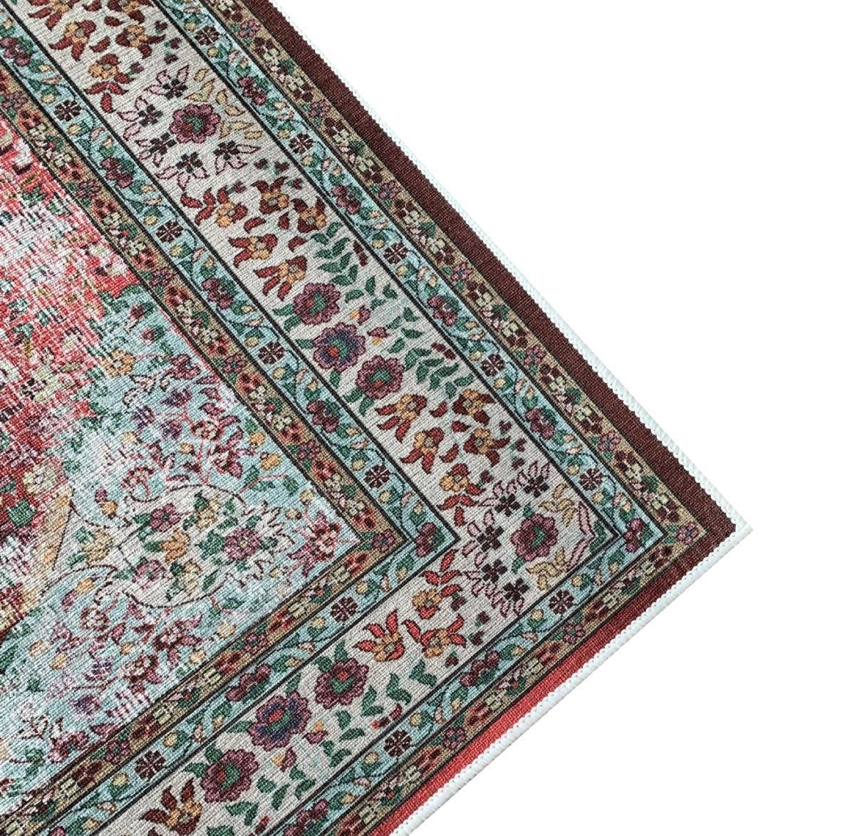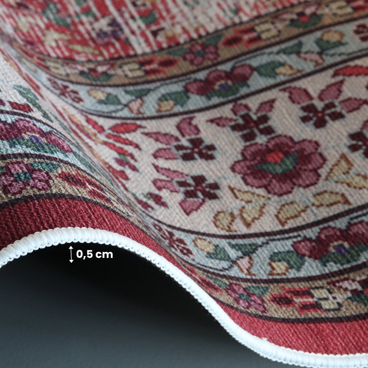 Dit oosterse tapijt is gemaakt van polyester en is circa 0,5 centimeter dik. Om optimaal gebruik te kunnen maken van het vloerkleed adviseren wij om wekelijks het vloerkleed te stofzuigen en af en toe om te draaien zodat de slijtage op veel belopen plekken voorkomen zal worden. Verder is het belangrijk om vlekken direct de verwijderen met een vochtige doek, lauwwarm water en groene zeep. Advies hierin is om de vlek van buiten naar binnen schoon te maken en natte plekken eerst droog te deppen met een schone droge doek of keukenpapier. Verpakking
