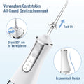 Met de IPX7 waterdichtheidscertificering is de waterflosser veilig te gebruiken onder de douche. Het 300 ml waterreservoir en de geheugenfunctie bieden extra gebruiksgemak. Dankzij de ingebouwde 2000 mAh lithium accu kun je met één volle lading tot wel 50 dagen vooruit. Is de waterflosser leeg? Met de meegeleverde USB-C kabel is het apparaat binnen 4-5 uur volledig opgeladen. Met de YHS waterflosser geniet je van een zelfverzekerde stralende lach, wittere tanden en gezond tandvlees.