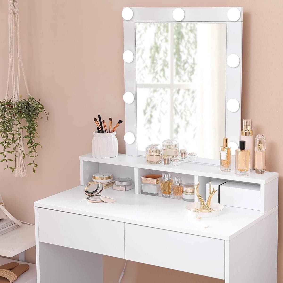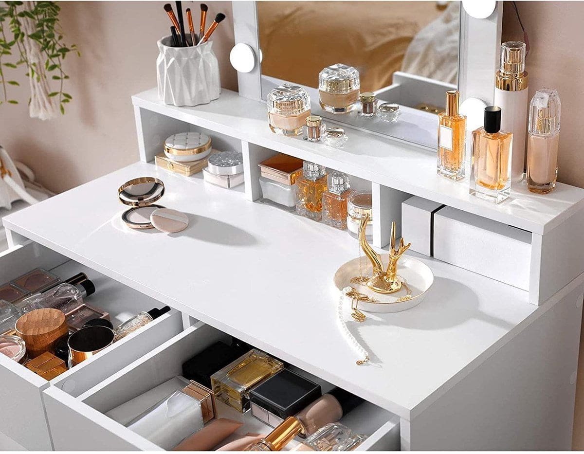 - BRIGHTLY START THE DAY: Het moderne design en de lichte kleur van deze cosmetische tafel zal altijd een glimlach op je gezicht toveren. Gebruik uw nieuwe sieraad om de nieuwste make-up trucjes uit te proberen.