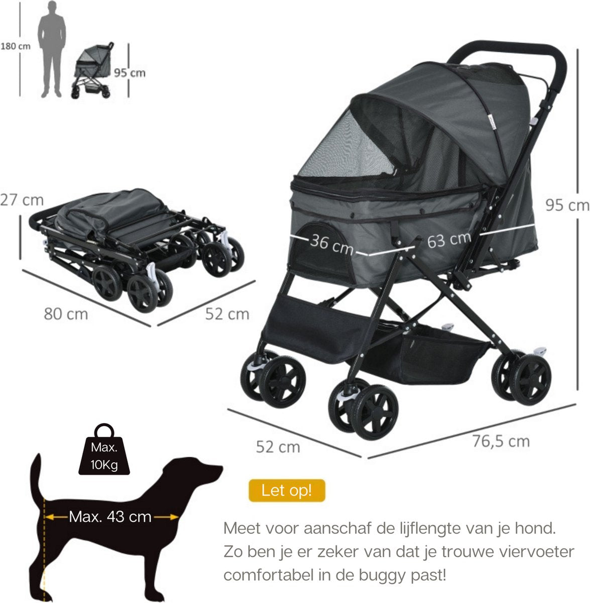 Met deze hondenbuggy kan jij je hond veilig meenemen op wandeltochten, naar de stad of naar het strand. Hij heeft licht lopende wielen en een stevig handvat zodat je hem gemakkelijk kunt voortduwen en besturen. Het zitgedeelte voor de hond is ruim en goed geventileerd door het toepassen van mesh stof. De handvat beugel is omkeerbaar zodat je hond naar jou of de omgeving kan kijken. Geschikt voor kleine honden zoals Bichon Frise, Mopshonden en Chihuahua’s.