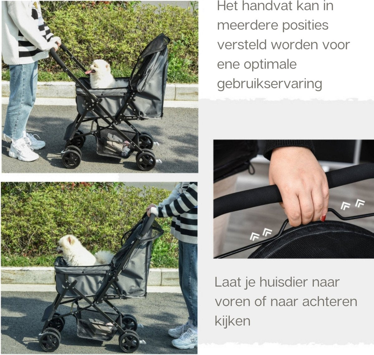 De positie van de duwstang is omkeerbaar zodat je huisdier naar voren of naar achteren kan kijken.