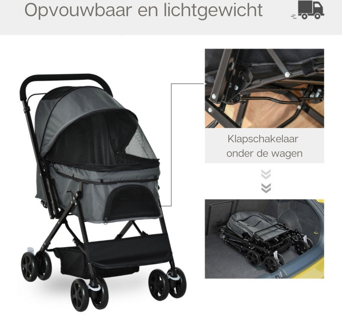 De bekleding van het zitgedeelte is van duurzaam Oxford-stof en heeft een gaasvenster om lucht binnen te laten. Verstelbare overkapping voor bescherming tegen zon, regen en wind.