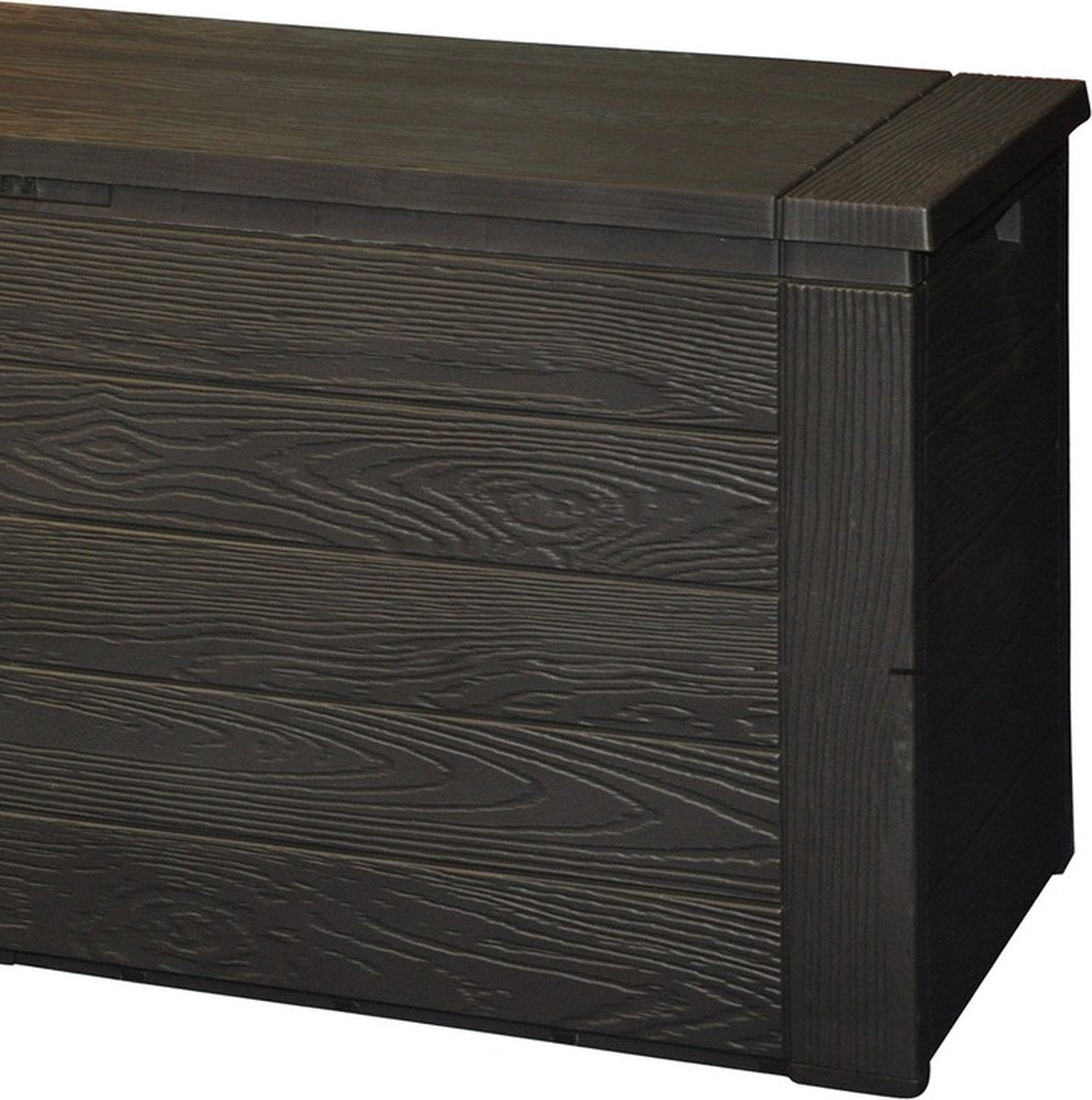 2 Stuks bruine tuin opbergboxen met hout patroon. Deze waterdichte en weervaste box kunt u gebruiken voor het opbergen van uw tuinkussens, maar natuurlijk ook voor speelgoed en tuingereedschap. Formaat: ca. 120 x 45 x 58 cm, inhoud: 300 liter. Materiaal: kunststof. De opbergboxen worden geleverd als een bouwpakket.