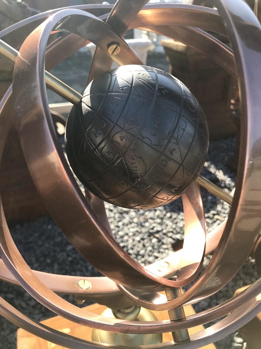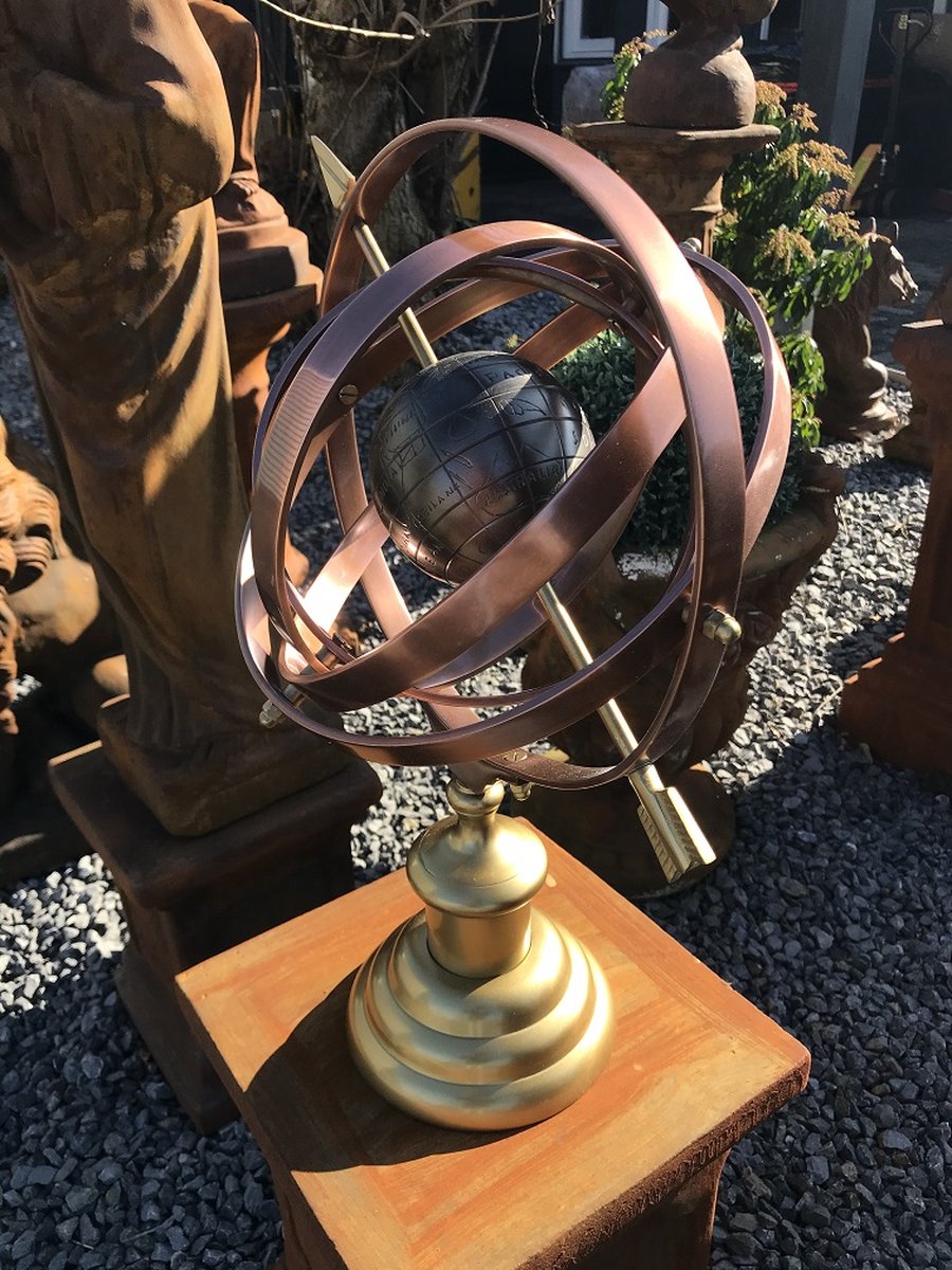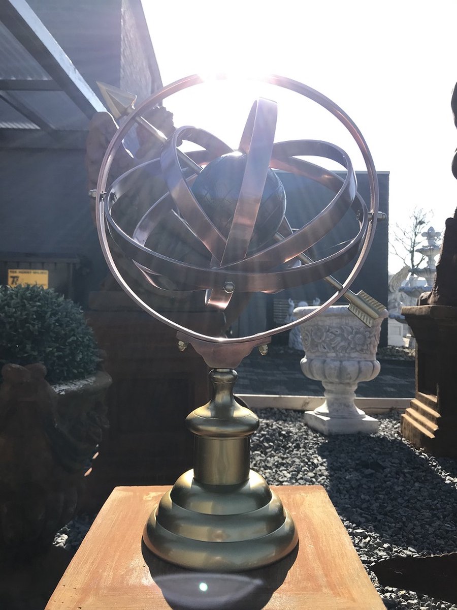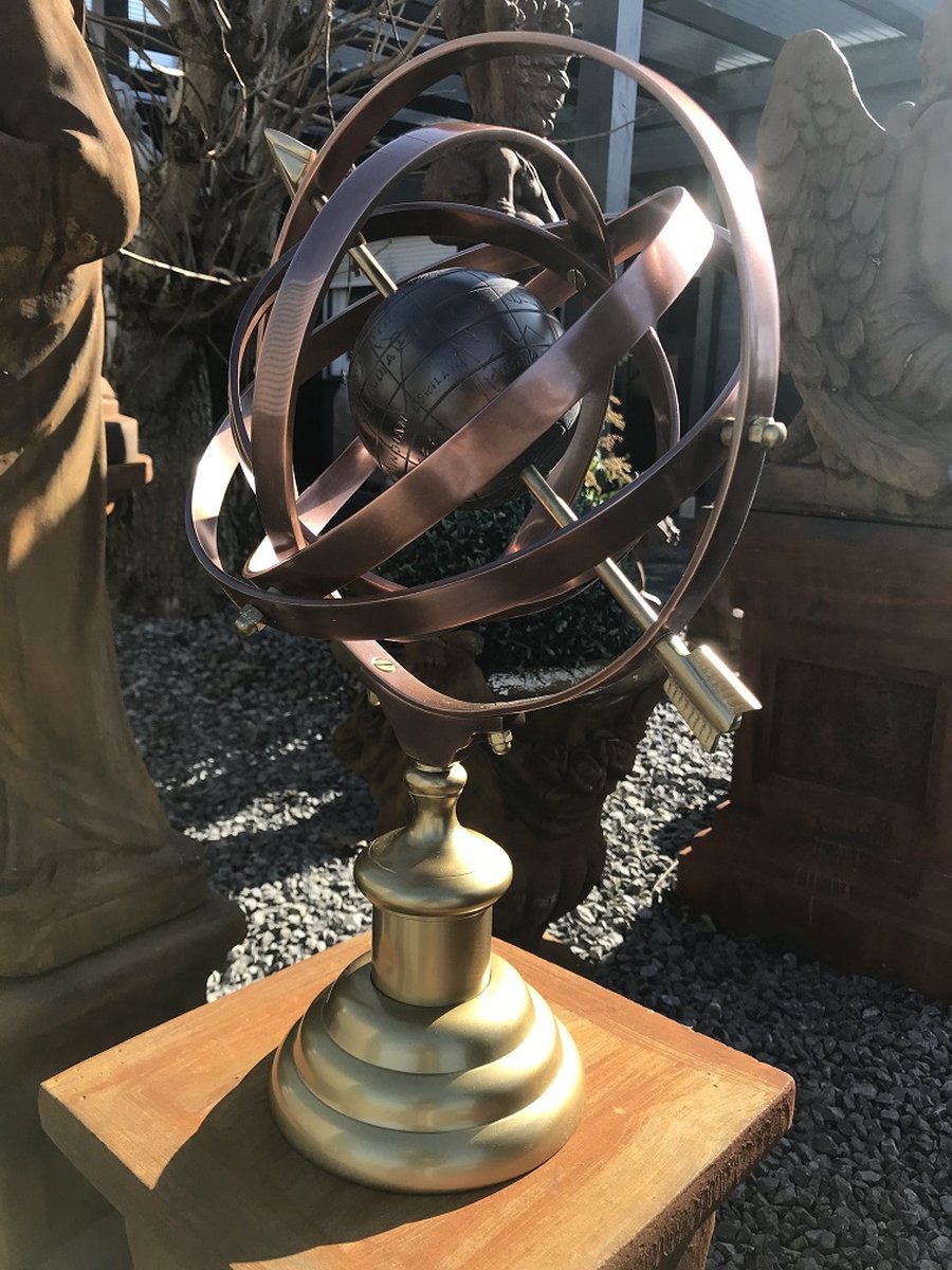 Deze zonnewijzer is van hoge kwaliteit, gemaakt van messing. De voet heeft een messing/koperen kleur en is van aluminium gemaakt. De zonnewijzer heeft als middelpunt aarde en daaromheen een lijnenstelsel die u kunt instellen naar wens. Deze lijnen stellen de andere planeten voor die om de aarde zouden draaien, zoals dit vroeger werd gedacht (geocentrisme). Het is een fraai vervaardigd en interessante zonnewijzer en fraaie tuindecoratie.