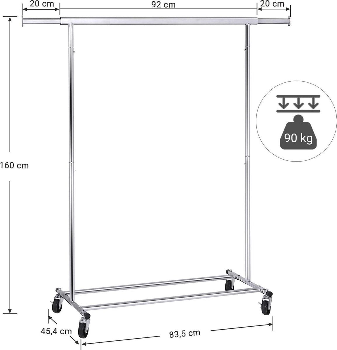 Zware metalen kapstok, tot 90 kg max. belasting, kapstok met wielen, inklapbaar, lengte 92-132 cm, verchroomd, industrie