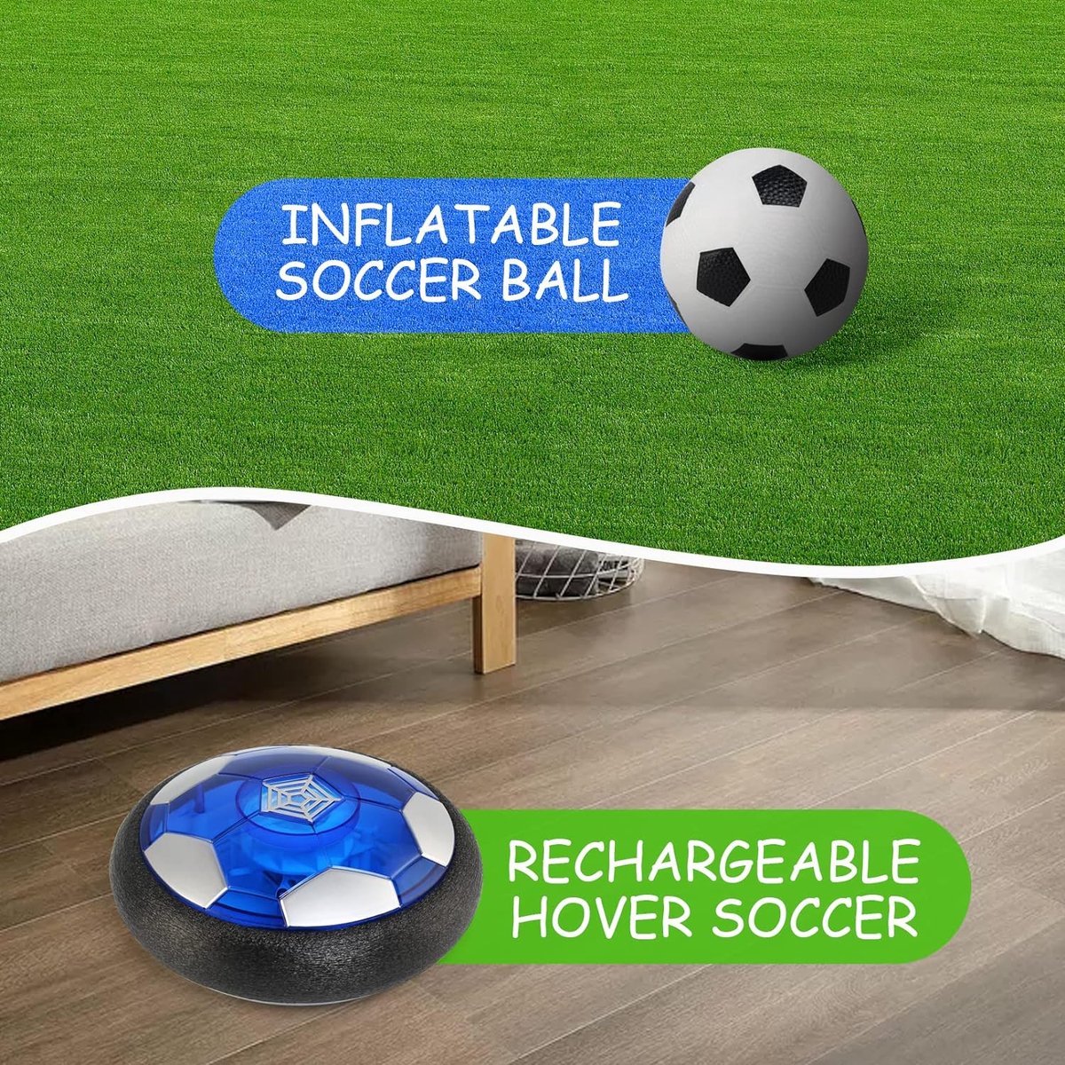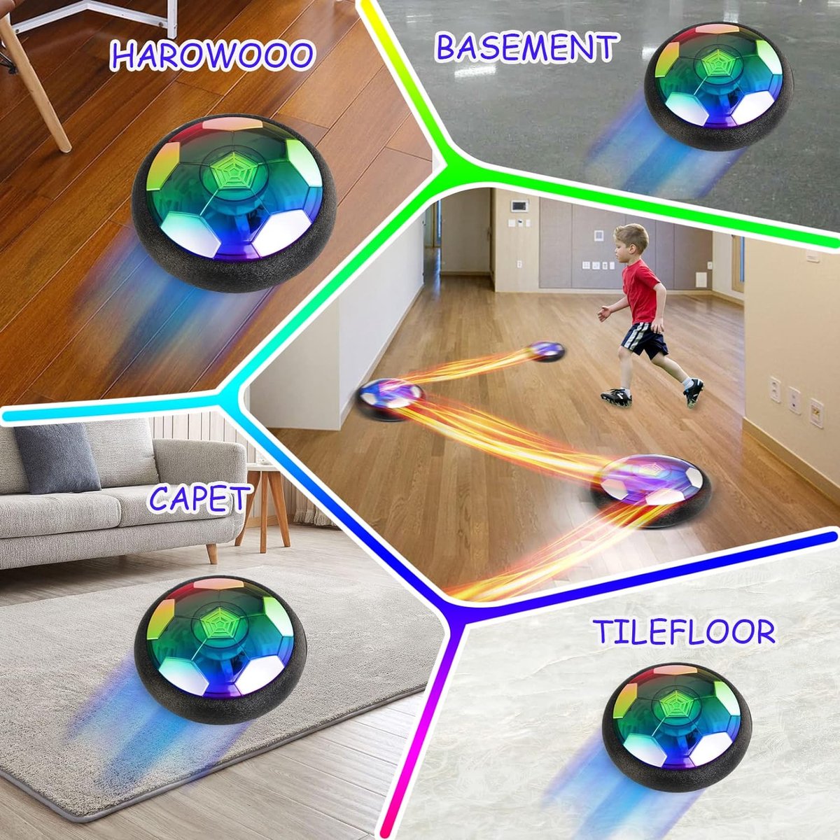 Innovatieve Luchtcirculatietechnologie De hover voetbal gebruikt een draaimotor en een krachtige ventilator om een luchtkussen te creëren, waardoor de bal gemakkelijk over gladde oppervlakken zoals hout, linoleum en zelfs laagpolige tapijten glijdt.